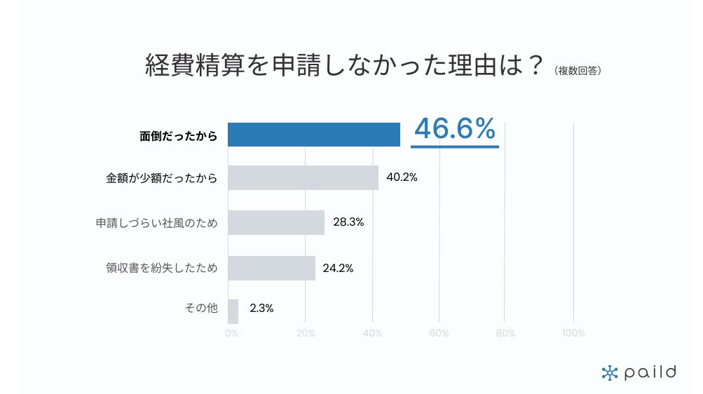 自腹で経費を負担した人の中で、経費精算時に申請をしなかった理由として最も多かったのは「面倒だったから」で46.6%、次いで「金額が少額だったから」が40.2%でした。その他、「申請しづらい社風のため」が28.3%、「領収書を紛失したため」が24.2%となりました。