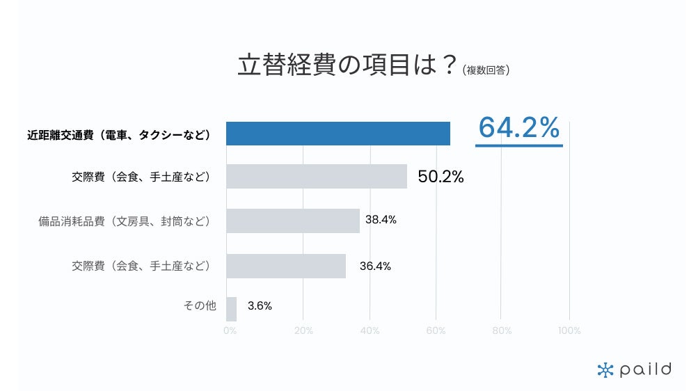 月あたりの立替経費項目で最も多かったのは電車やタクシーなどの「近距離交通費」で64.2%、僅差で「会食などの交際費」が50.2%でした。そのほか宿泊費や新幹線などの「出張費」が38.4%、文房具やコピー用紙などの「会社備品」が36.4%となりました。