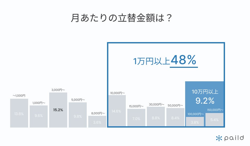 ■月あたりの立替金額が1万円以上の人は48%で、そのうち10万円超えは9.2%