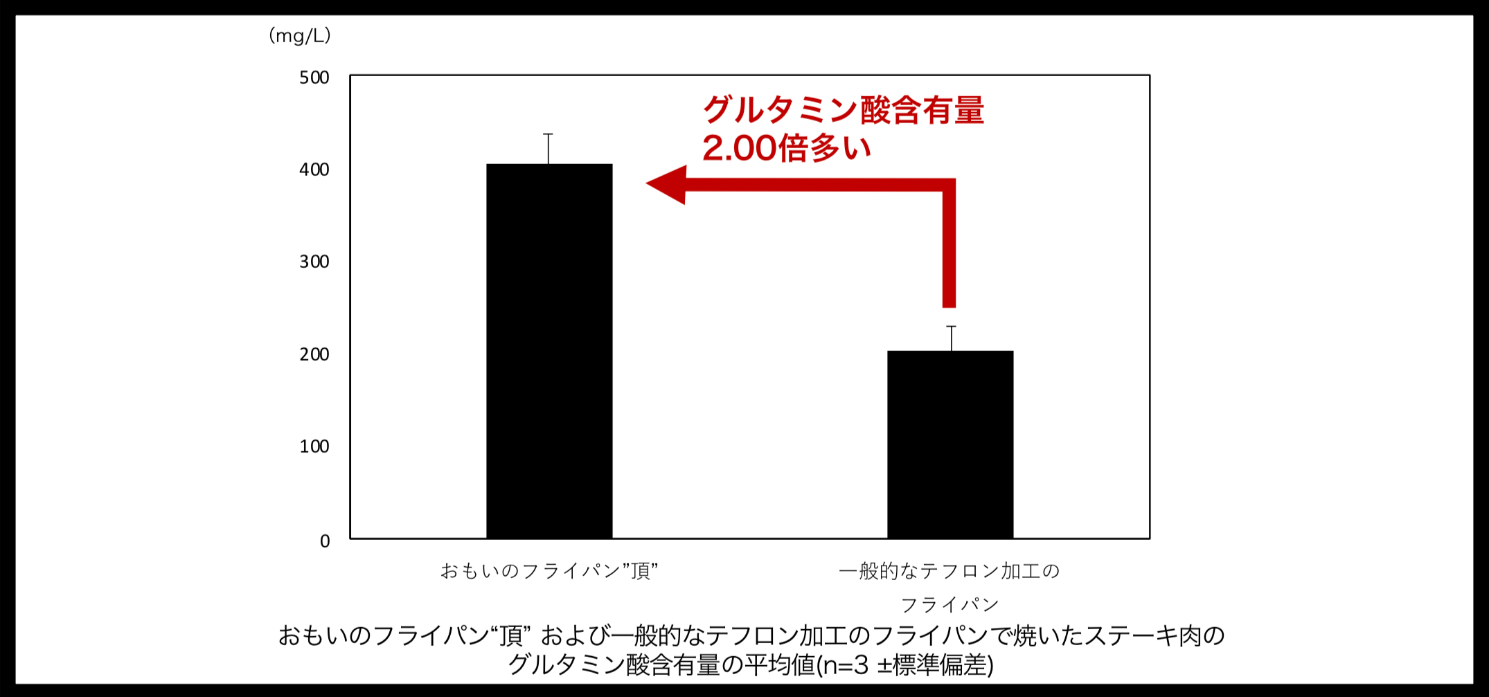「おもいのフライパン“頂”」で焼いたステーキ肉のグルタミン酸含有量は404.38mg/Lであり、一般的なテフロン加工のフライパンで焼いたステーキ肉の202.55mg/Lと比較して、2.00倍であった。つまり、「おもいのフライパン“頂”」で焼くことでステーキ肉の旨味成分が保持されやすいと示された。