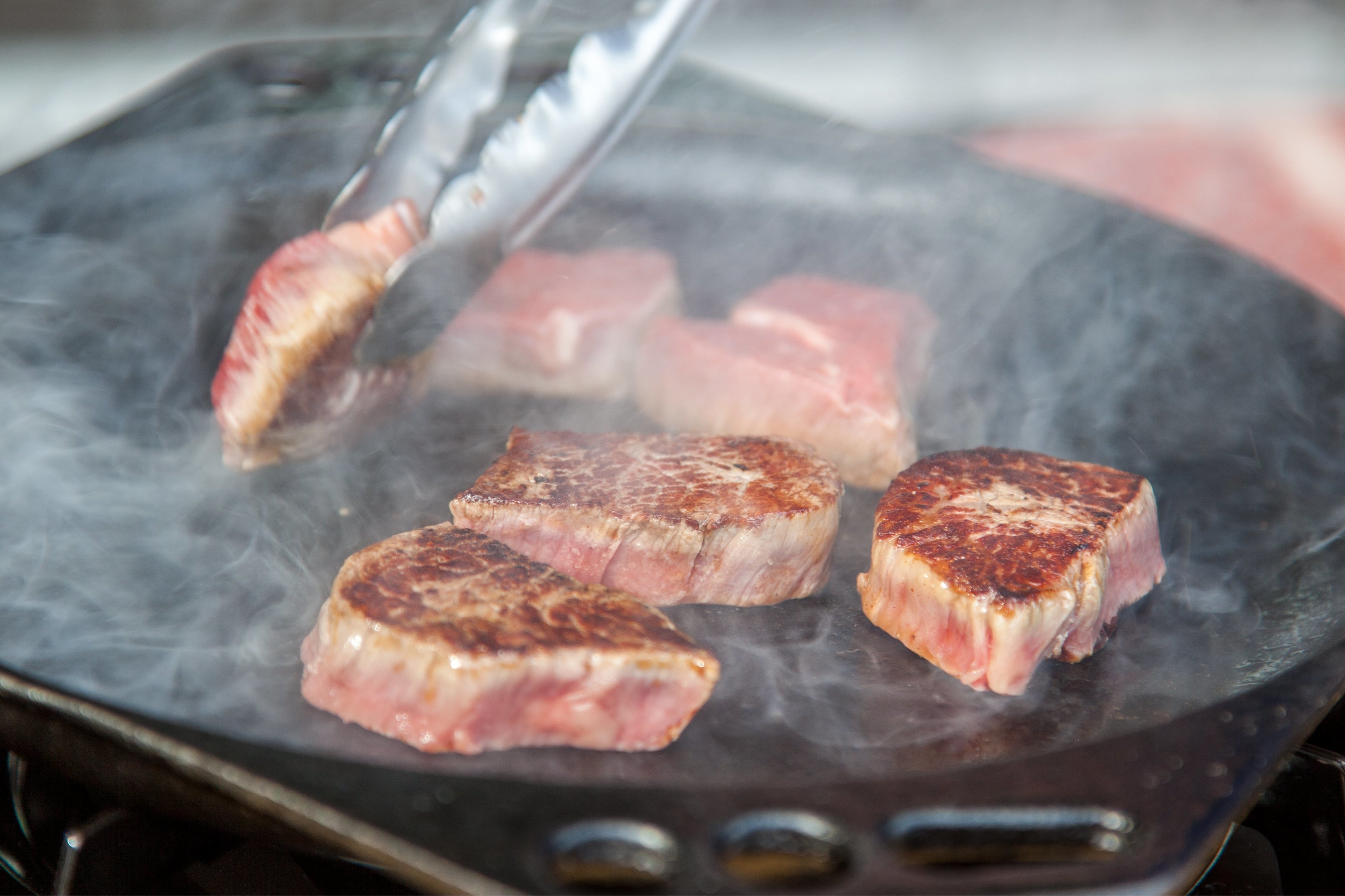 「おもいのフライパン“頂”」を使ったおいしいステーキの焼き方は驚くほど簡単。フライパンを煙が出るくらいまで熱々に熱したら牛脂をひき、肉の厚み1㎝に対して、表1分、裏1分、さっと表面を焼き肉汁を閉じ込めたら、お皿にあげて1分余熱で休ませます。さらに厚い肉ならこの工程を繰り返すだけ。調味料は焦げの原因になることがあるので、はじめは何も付けずに焼いて、食べる前に塩やスパイスを付けるのがベストです。