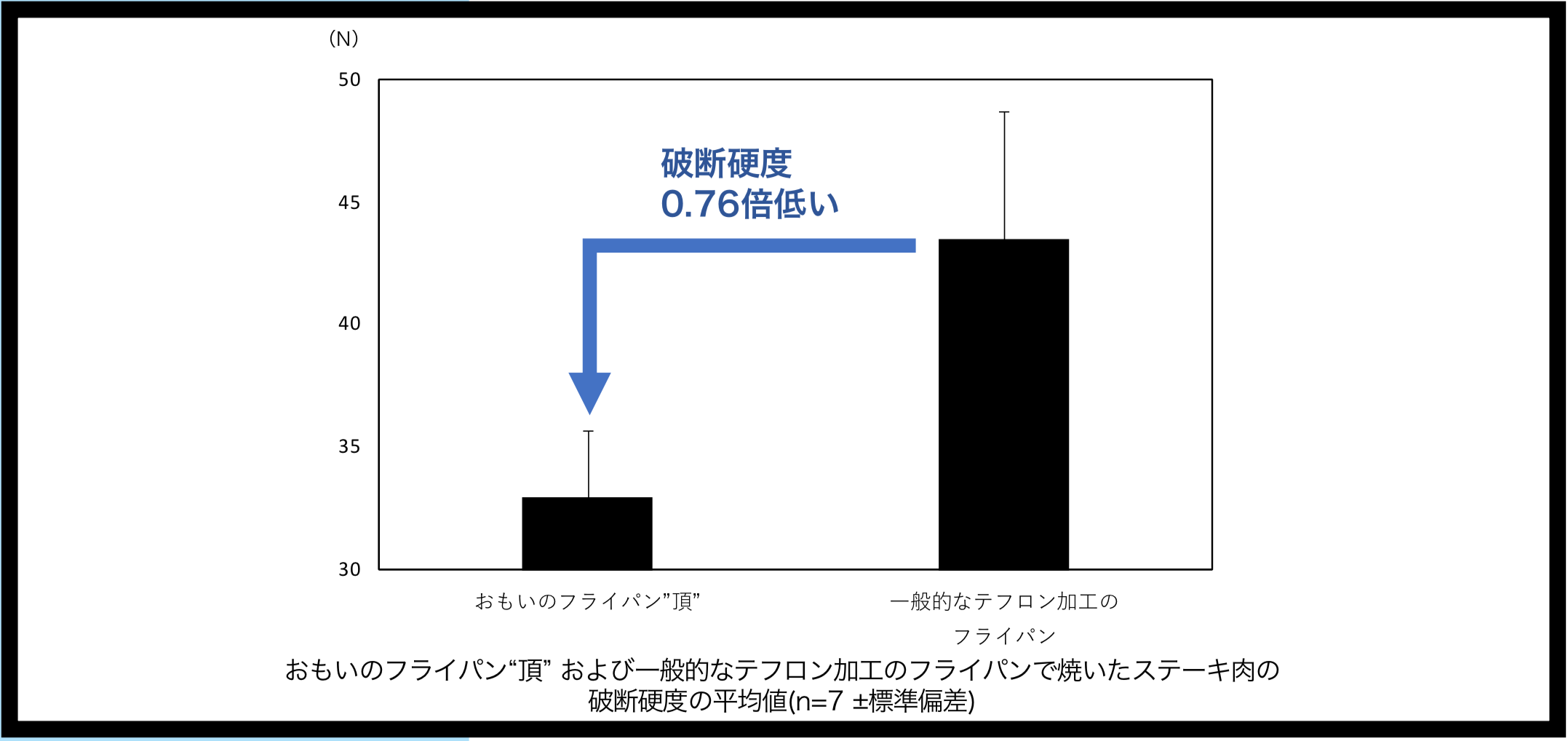 「おもいのフライパン“頂”」で焼いたステーキ肉の破断硬度は32.92Nであり、一般的なテフロン加工のフライパンで焼いたステーキ肉の43.42Nと比較して、0.76倍であった。つまり、「おもいのフライパン“頂”」でステーキ肉を焼くことで肉質をやわらかくできることが明らかとなった。