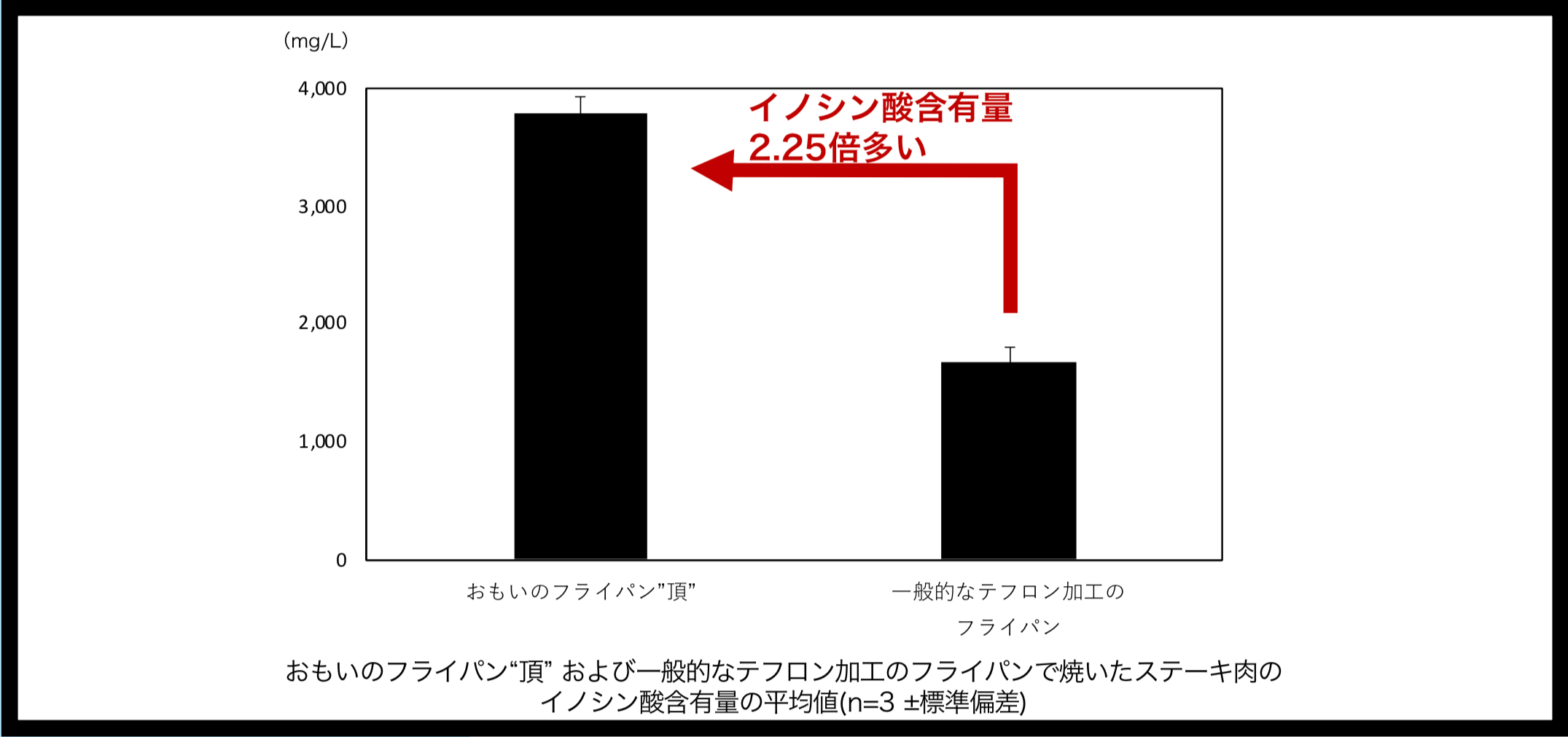「おもいのフライパン“頂”」で焼いたステーキ肉のイノシン酸含有量は3786.19mg/Lであり、一般的なテフロン加工のフライパンで焼いたステーキ肉の1679.52mg/Lと比較して、2.25倍であった。つまり、「おもいのフライパン“頂”」で焼くことでステーキ肉の旨味成分が保持されやすいと示された。