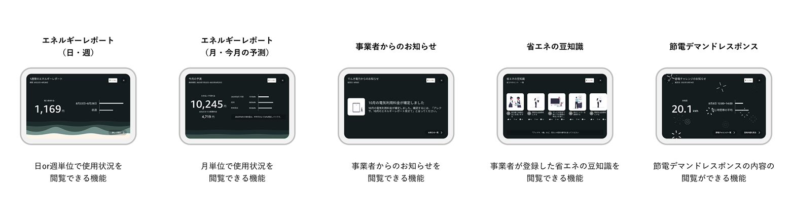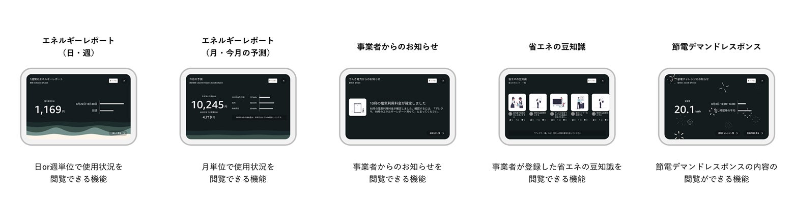 大阪ガスが「エネルギーダッシュボード」を活用することで、利用者は、Alexaが搭載されたEcho Show8/Echo Show5でエネルギーの利用データの確認、1カ月の予測使用量のお知らせや運営からのお知らせの受信、大阪ガスが実施する節電デマンドレスポンスへの参加などの機能が利用できるようになります。