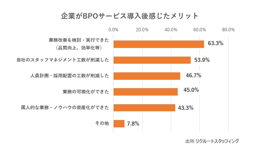 リクルートスタッフィングで昨年実施した企業向けアンケートの結果によると、リクルートスタッフィングのBPOサービス導入後にメリットを感じたという企業の内、約63.3%に「自社の品質向上や効率化などの業務改善につながった」と回答をいただきました。