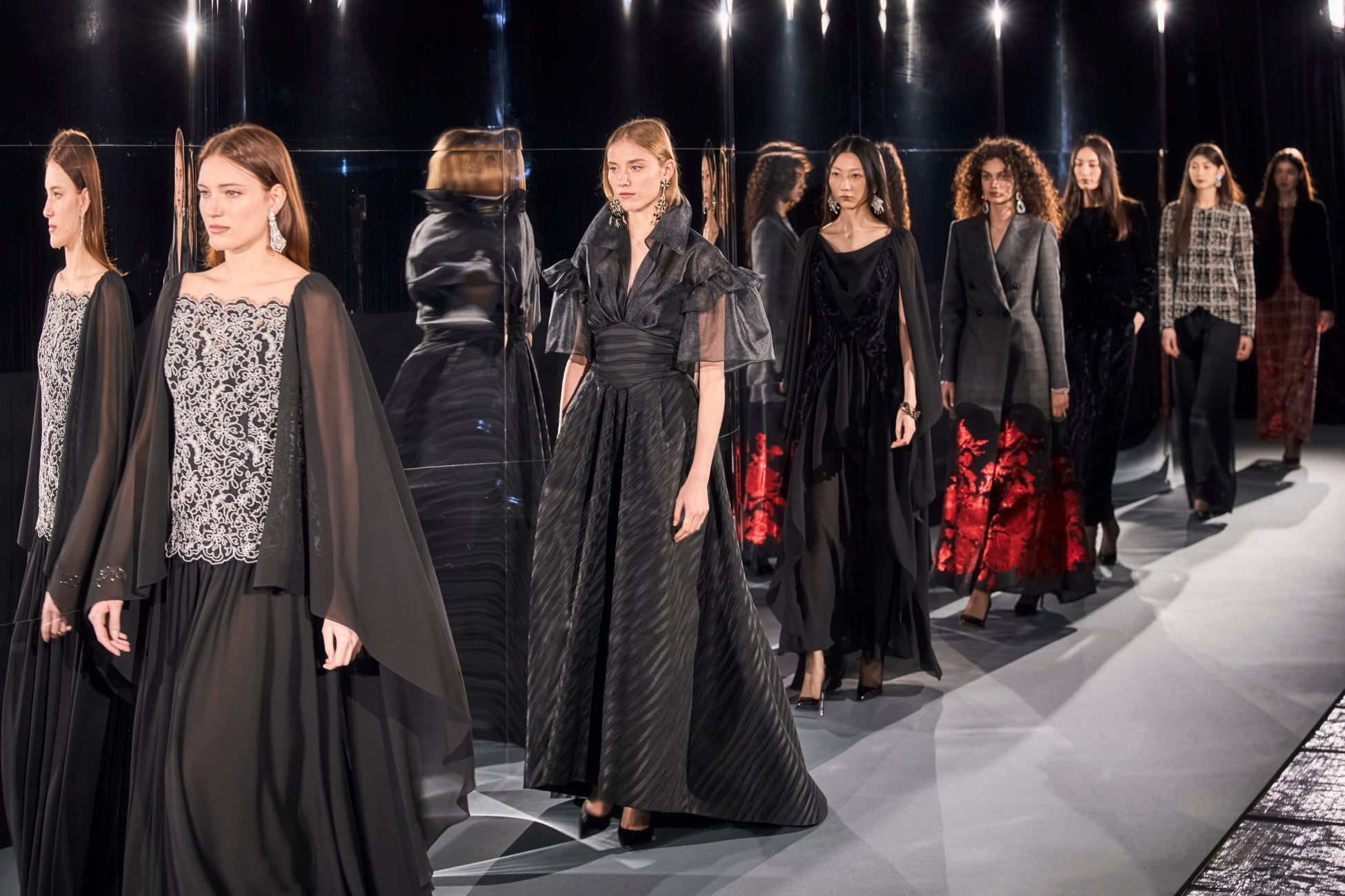 新作を纏ったモデルと波を打つように連なるミラーの「反射」が幻想的な空間を演出します。