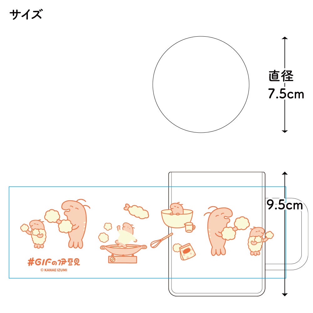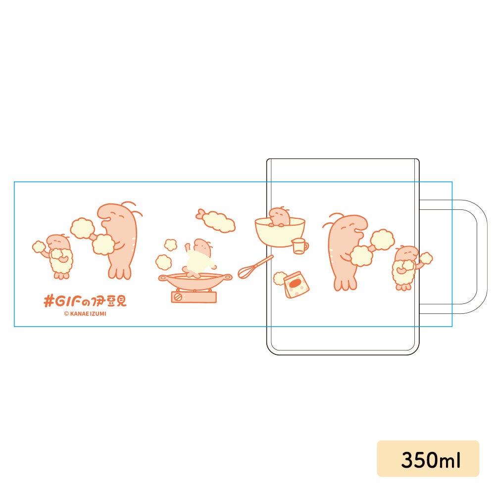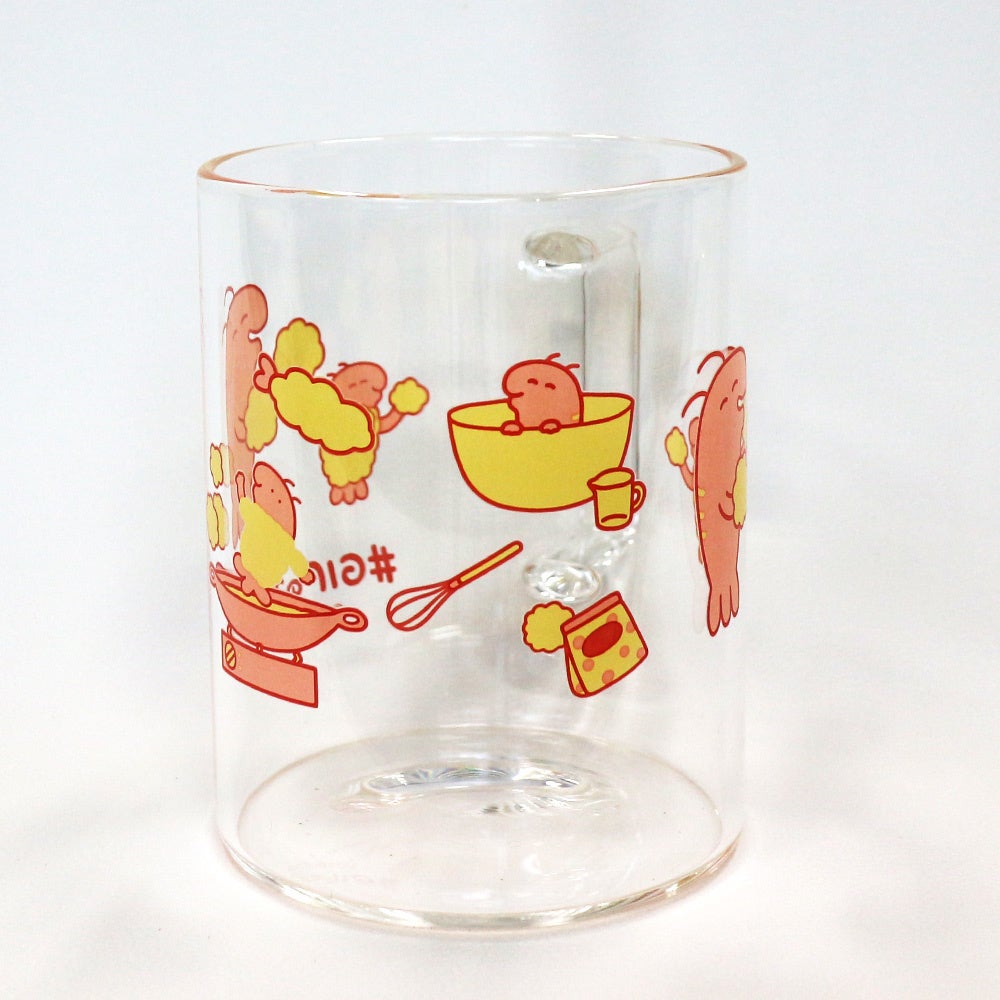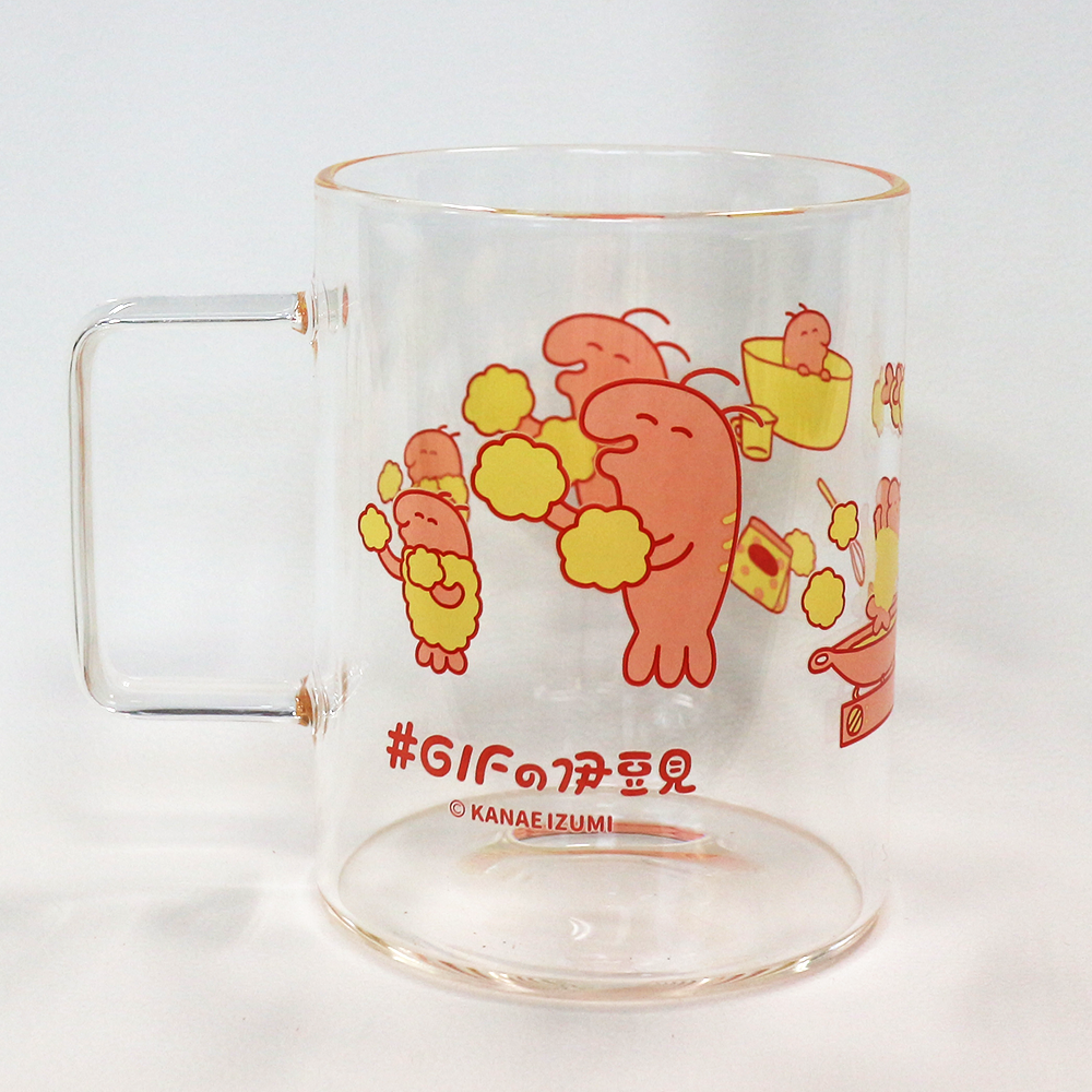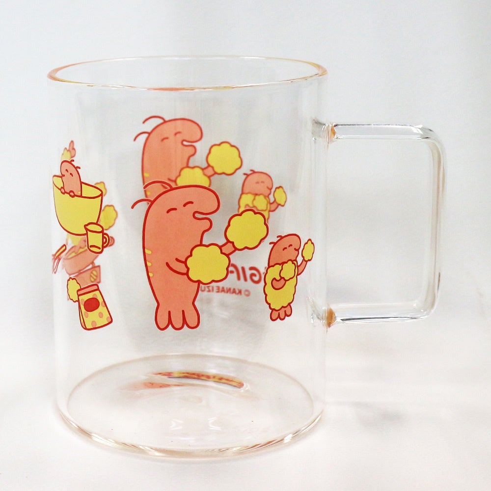 えび天動画のイラストをあしらったガラスマグカップ。電子レンジOK!お湯OK!冷たい飲み物もOKの春夏秋冬、いつでも使える便利なグラスです。