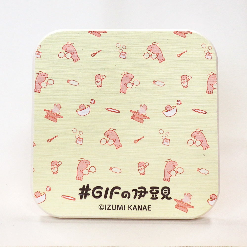 えび天動画のえっびっとこえびをちりばめた吸水コースター。珪藻土を使っているのでぐんぐん吸水して机が濡れるのを防ぐ優れものです。
