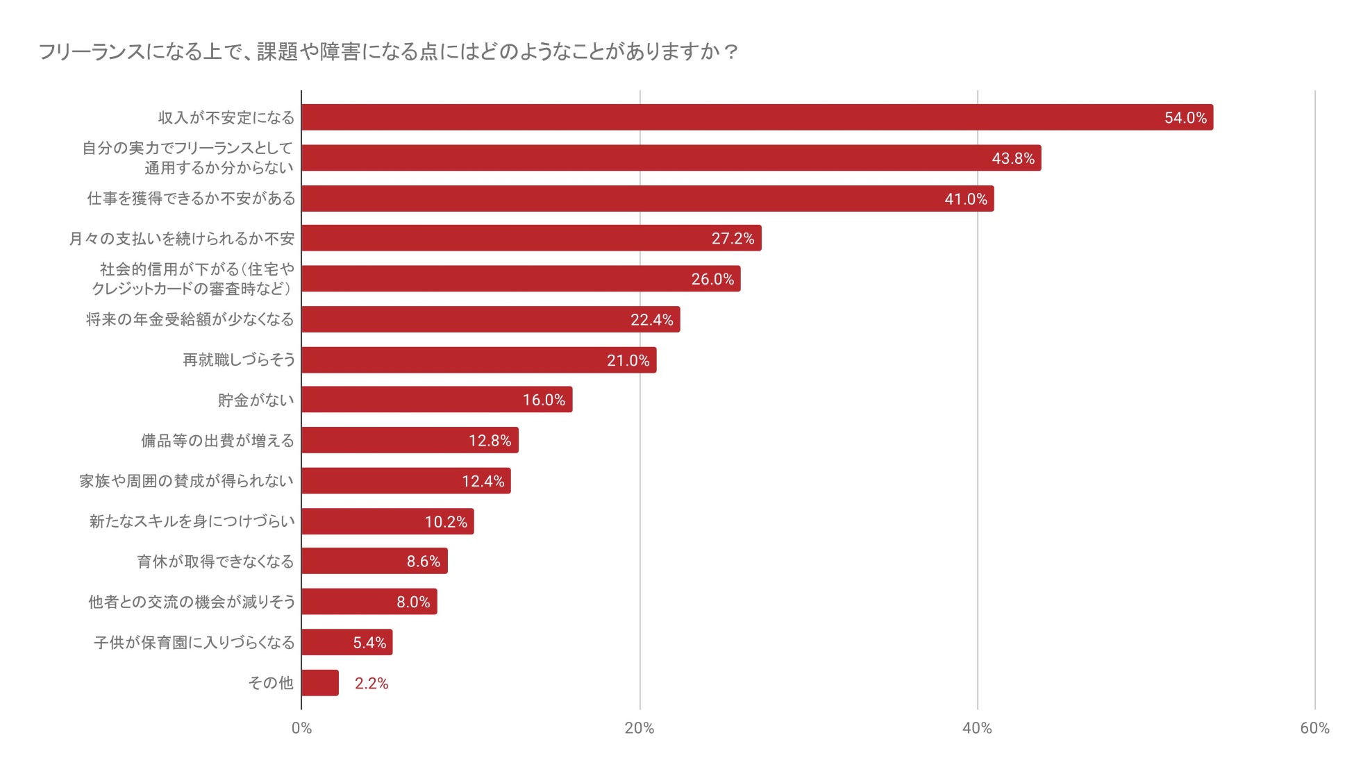 - フリーランスになる上での課題や障壁TOP3は「収入が不安定になる」「自分の実力でフリーランスとして通用するか分からない」「仕事を獲得できるか不安がある」
