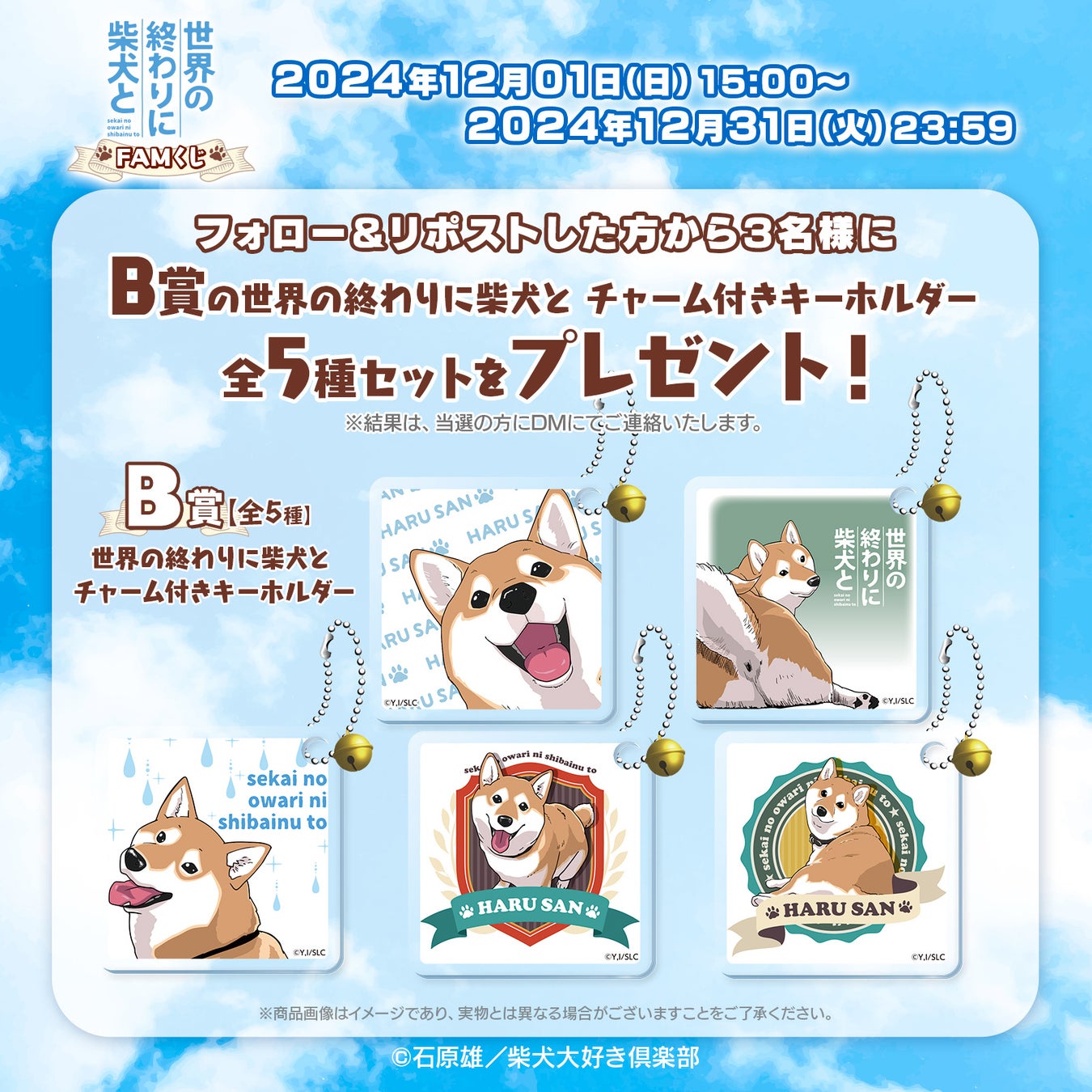 期間中に「FAMくじオンライン」の公式Xアカウント(@FAMKUJI_ONLINE)をフォローし、キャンペーン投稿をリポストすることで、抽選で3名様にB賞の「『世界の終わりに柴犬と』チャーム付きキーホルダー」全5種セットをプレゼントします。