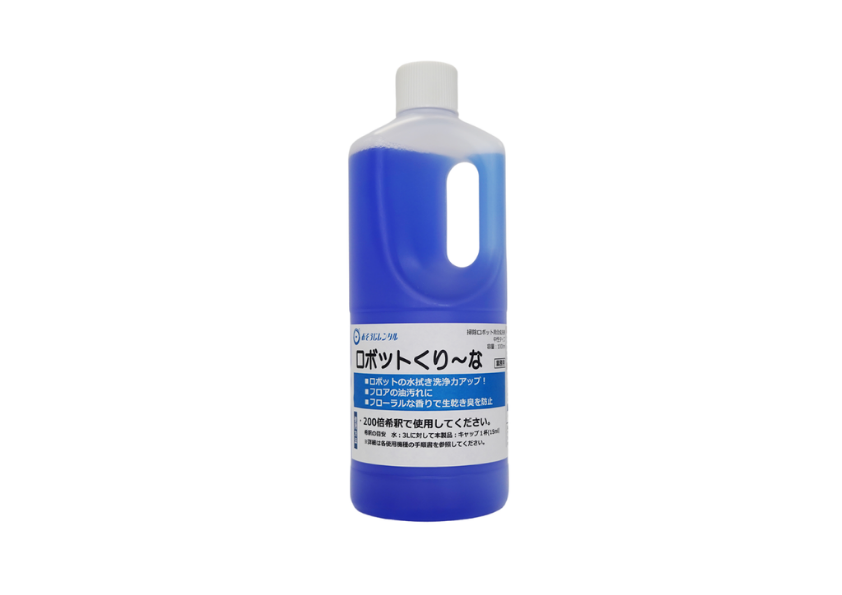 掃除ロボットや電動モップの水拭き洗浄力をアップさせ、フロアの油汚れを解消する専用洗剤。