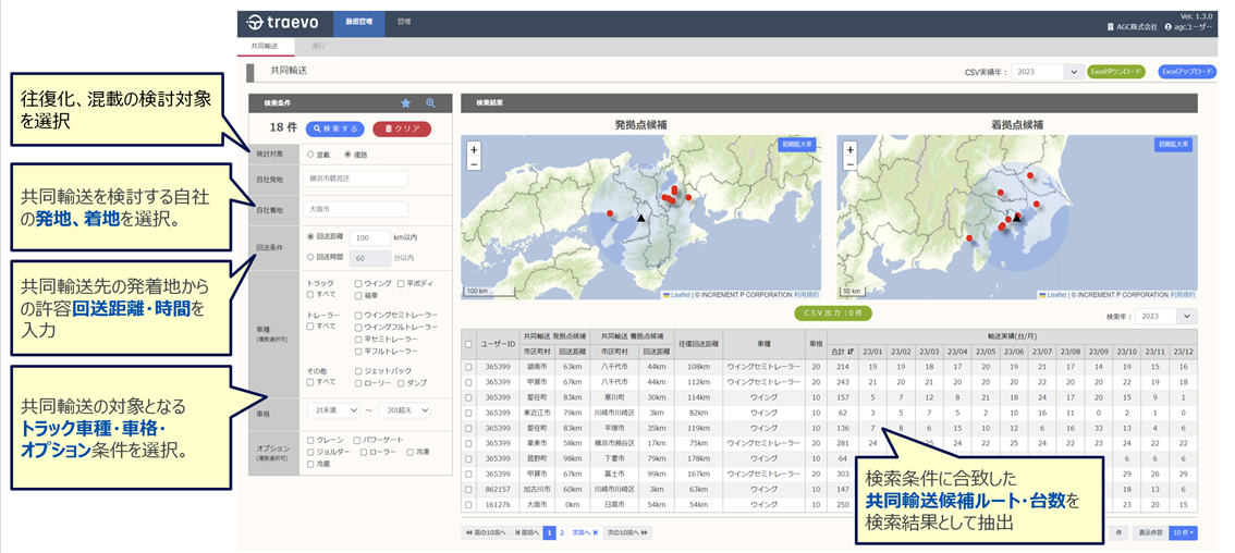 TDBCの共同輸送データベース構築とその先のフィジカルインターネット推進ワーキンググループでは、中長期の共同輸送相手を検索するユニバーサルシステムを構築、主に本州での実証実験と北海道での経済産業局の実証事業を経て共同輸送相手の探索サービス「traevo noWa」を2025年8月1日にサービスインしました。