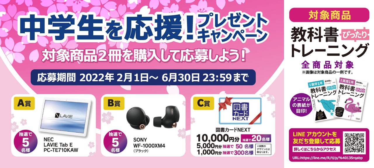 『教科書ぴったりトレーニング』を2冊購入(全教科対象)し、LINE公式アカウント「新興出版社for中学生」に友だち登録することで中学生に人気のタブレットやワイヤレスイヤホン、図書カードが当たるプレゼントキャンペーンにご応募できます。