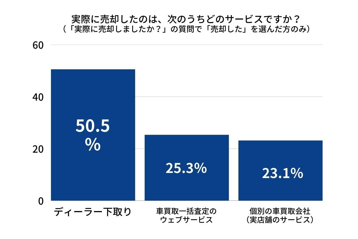 ディーラー下取りが過半数を占め、その残りを「車買取一括査定のウェブサービス」と「個別の車買取会社」とで分け合う結果となっています。