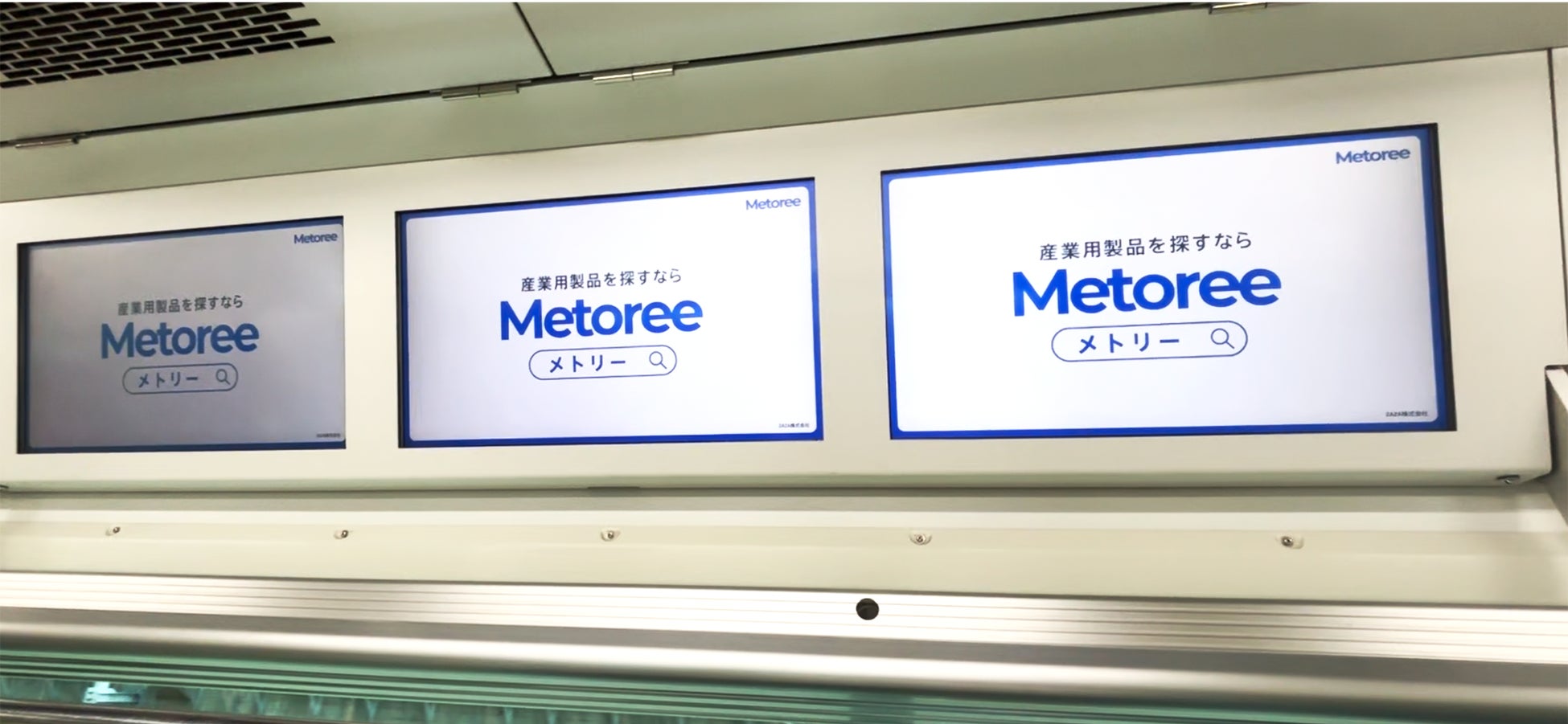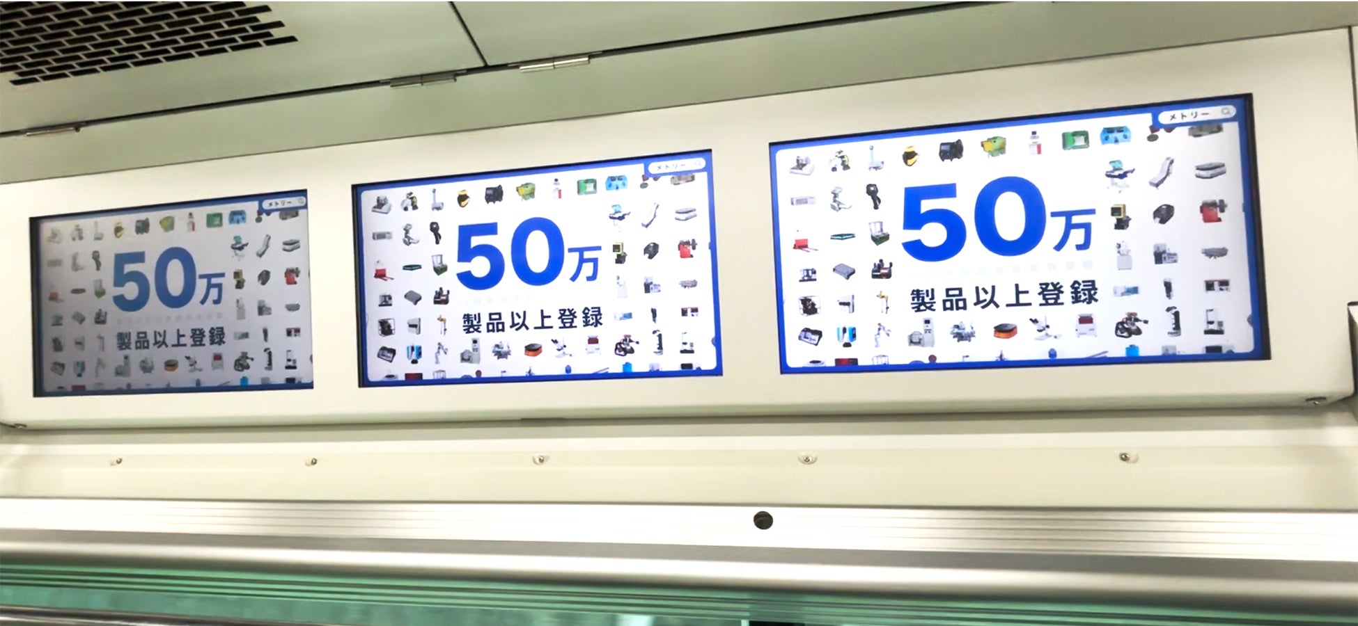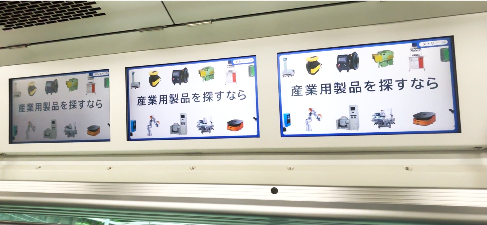 JR山手線等の車内デジタルサイネージでは、「産業用製品を探すなら」というキャッチフレーズとともに、50万製品以上登録、掲載企業数8万社、日本最大級の利用者数を誇るメトリーの特徴を全面に出し、実用性と利便性を伝えています。