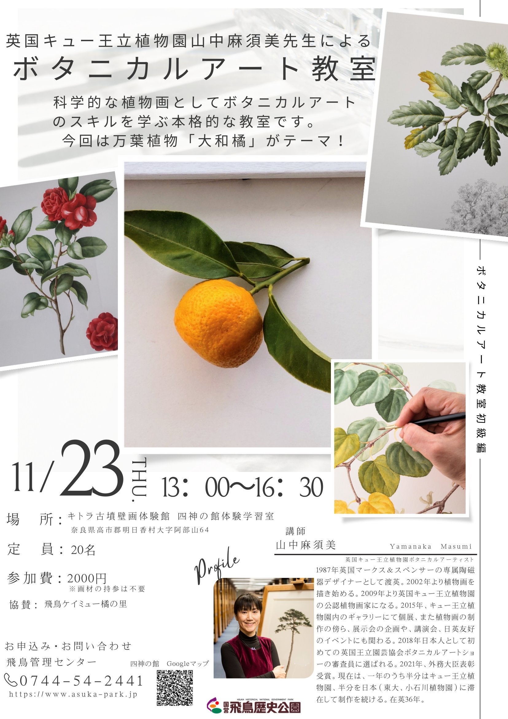 国営飛鳥歴史公園では、2023年11月23日(木・祝)に英国キュー王立植物園の山中麻須美さんを講師にお呼びし、「ボタニカルアート教室」を開催します。