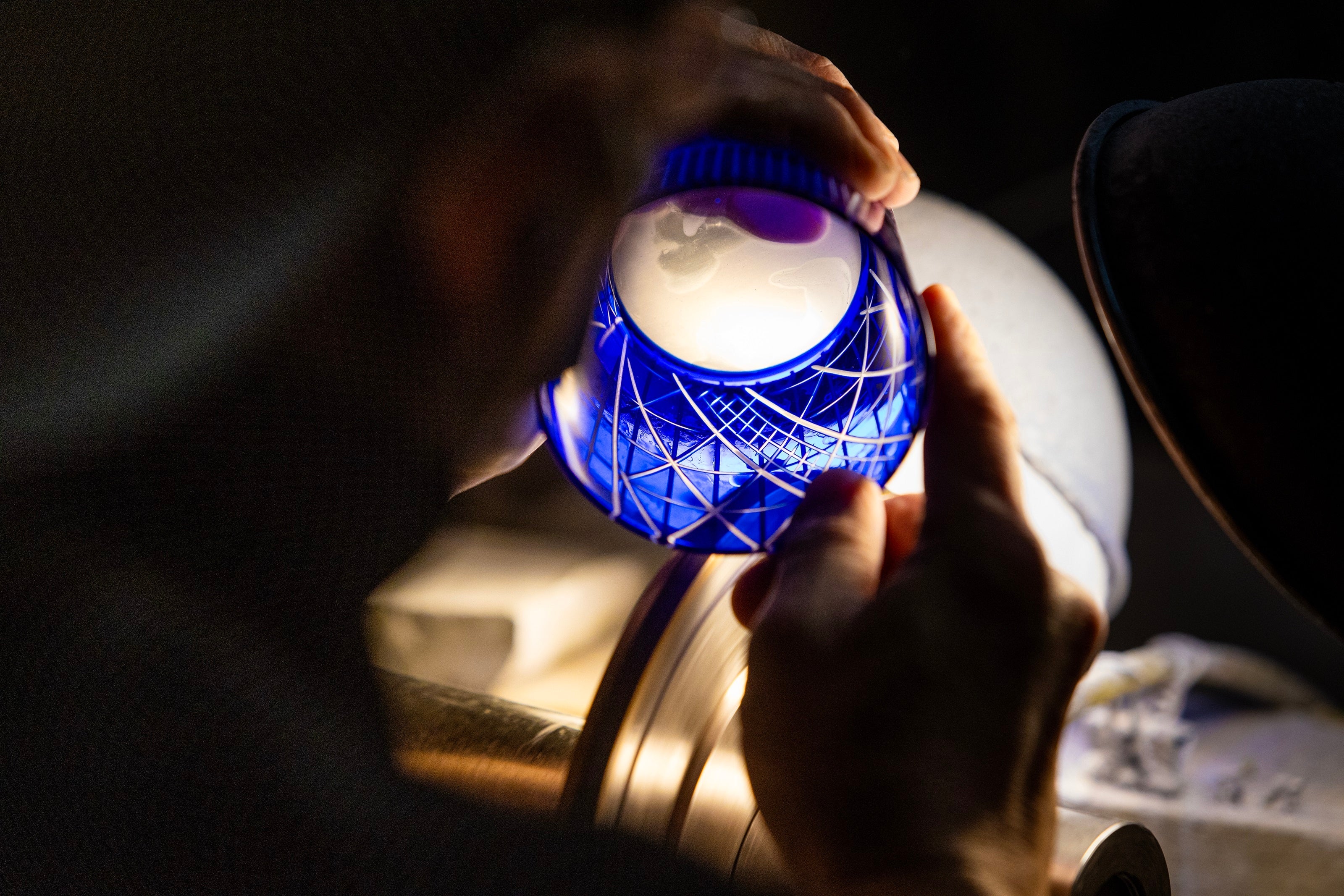 江戸時代後期に興り、現在では国が定める伝統的工芸品に指定され受け継がれる東京の「江戸切子」。その繊細なカットの美しさを存分に堪能できるグラス。墨田区認定の江戸切子専門工房である「すみだ江戸切子館®」の職人が手がけました。ベースとなるのは目黒川のせせらぎをイメージしたブルーのグラス生地で、コーヒーやティー、アルコールに加え、アイスクリームや食事にも活用できるよう背の低いロックグラス風のシェイプに仕上げました。「麻の葉紋様」をはじめとする和の伝統模様をあしらいつつも、モダンなアシンメトリーのレイアウトで、ロースタリー 東京にふさわしい多角的なエッセンスを感じられる一品です。切子職人が長年の経験に裏打ちされた指先の絶妙な感覚を頼りに、線の太さ、深さ、角度を調整し描き出すカットは、光を集めて反射し、宝石のように美しい輝きを放ちます。