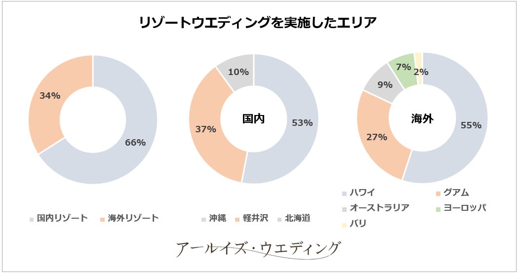 リゾートウエディングを実施された方のうち、国内リゾートで結婚式をされた方が66%で、海外リゾートで実施された方は34%という結果に。国内リゾートのうち、沖縄が最も多く53%で、次いで軽井沢が37%。海外リゾートのうち、ハワイが最も多く55%で、次いでグアムが27%でした。