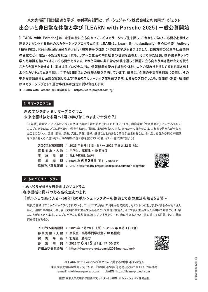 ポルシェジャパン株式会社(本社:東京都港区)は、東京大学先端科学技術研究センター個別最適な学び寄付研究部門と共に、中高生を対象とした夏休みの期間を利用する5日間のスカラーシッププログラム『LEARN with Porsche (ラーン ウィズ ポルシェ)2025』(「サマープログラム」と「ものづくりプログラム」)を開催します。どちらのプログラムも2025年5月1日(木)より全国の学生を対象に一般公募を開始しています。