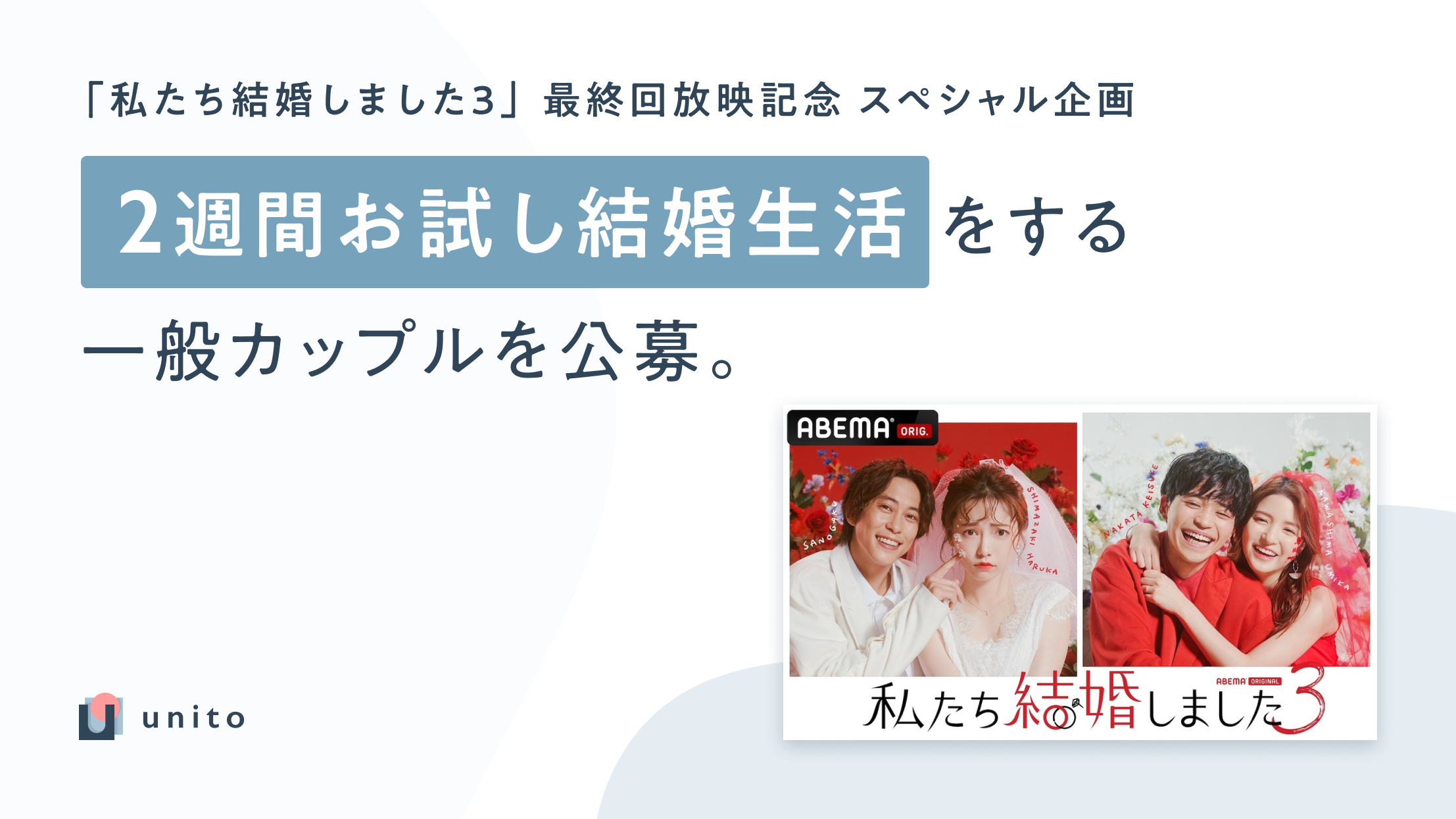 「私たち結婚しましたシーズン3」最終回放映を記念し、拠点提供のunitoが「#2週間お試し結婚生活」をするカップルを一般公募