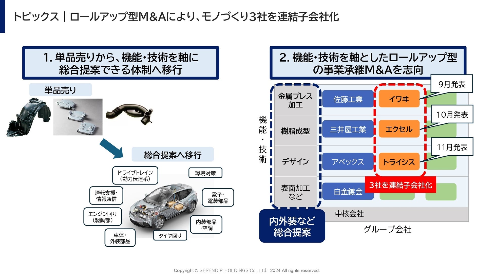 セレンディップグループは、中堅・中小製造業に特化した事業投資会社です。M&Aによって事業承継した子会社で構成する「モノづくり事業」、プロ経営者派遣やコンサルティングによってモノづくり企業へソリューションを提供する「プロフェッショナル・ソリューション事業」、投資やフィナンシャルアドバイザリーによって中堅・中小企業の円滑な事業承継を支援する「インベストメント事業」を展開しております。