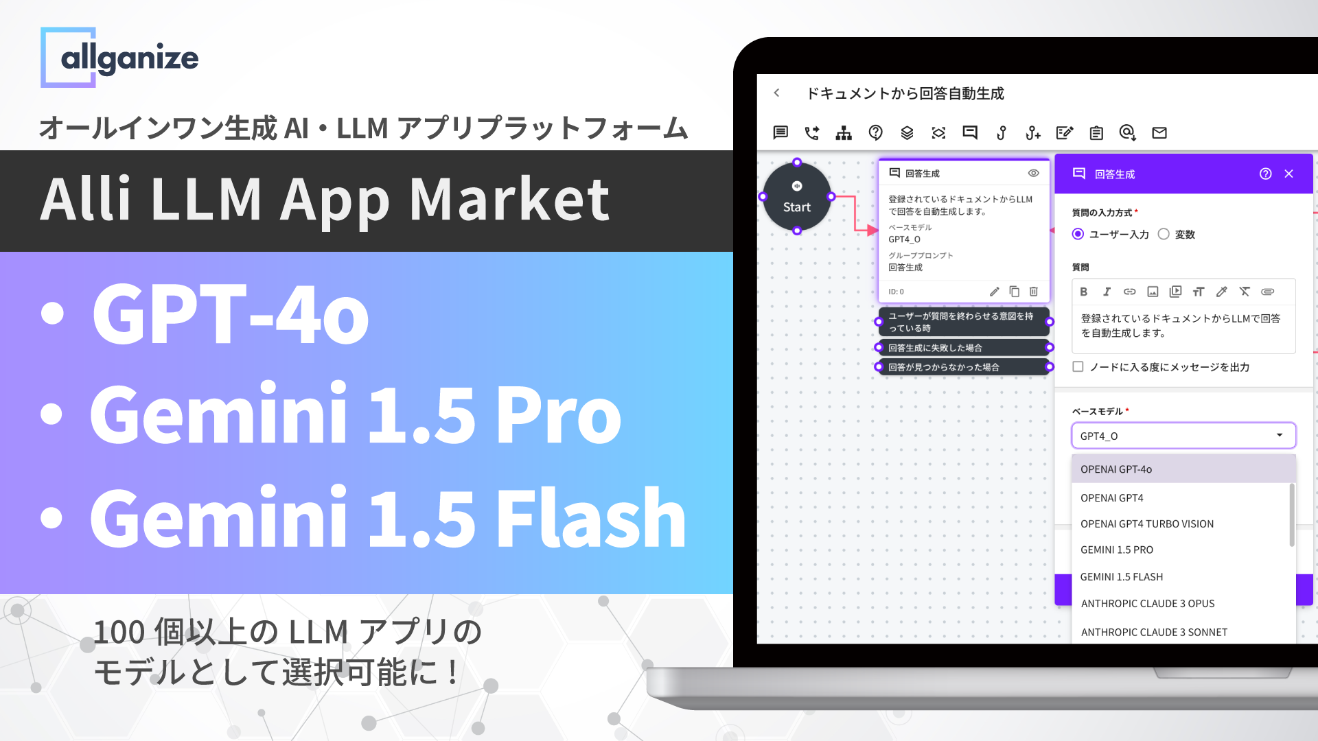 Allganizeは、企業向けオールインワン生成AI・LLMプラットフォーム「Alli LLM App Market」の選択可能なLLMモデルとして、OpenAI社のGPT-4o(omni)、Google社のGemini 1.5 ProおよびGemini 1.5 Flashの3モデルに対応を開始しました。