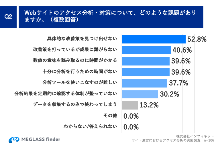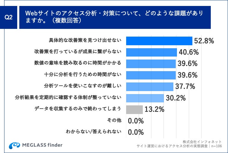Q1で「とてもある」「ややある」と回答した方に、「Q2.Webサイトのアクセス分析・対策について、どのような課題がありますか。(複数回答)」(n=106)と質問したところ、「具体的な改善策を見つけ出せない」が52.8%、「改善策を打っているが成果に繋がらない」が40.6%、「数値の意味を読み取るのに時間がかかる」が39.6%という回答となりました。