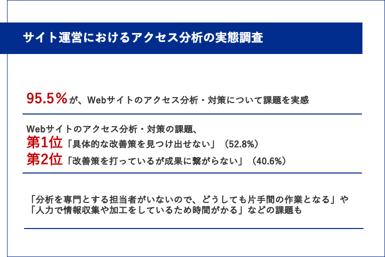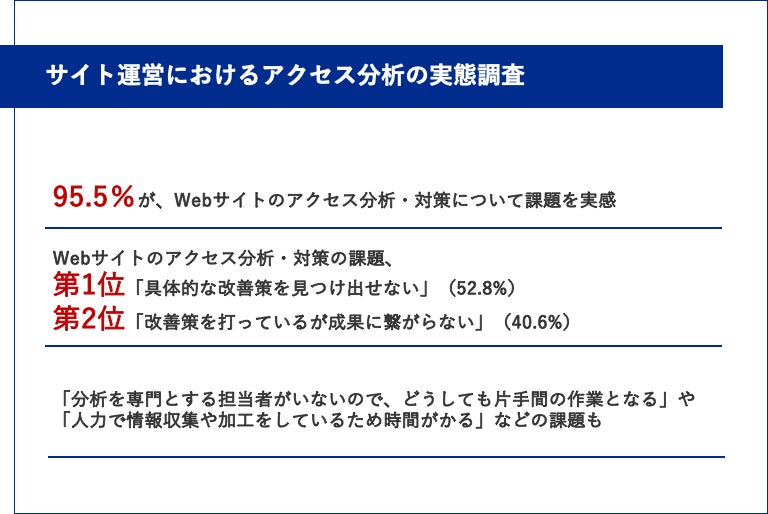 【Webサイトに成果をもたらすアクセス分析とは?】兼任Web担当者の95.5%が、アクセス分析・対策に「課題」を実感!「具体的な改善策を見つけ出せない」などの声