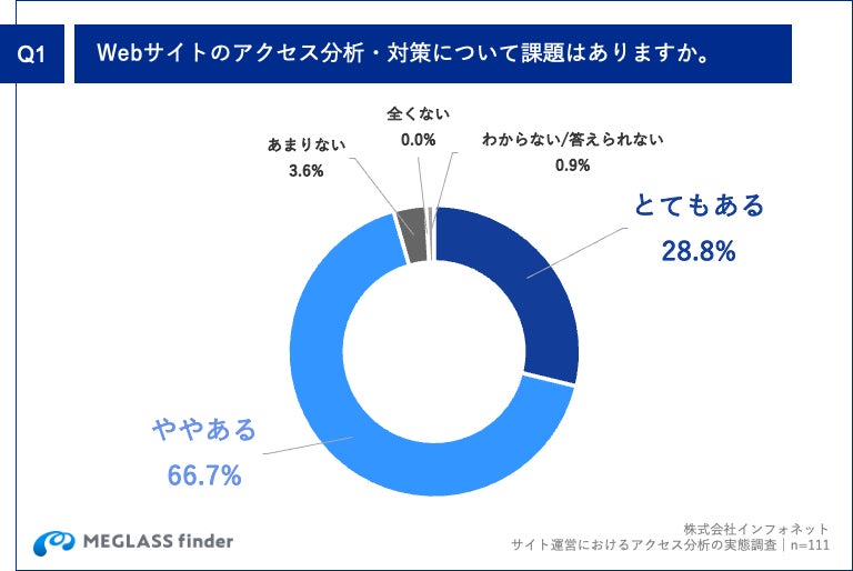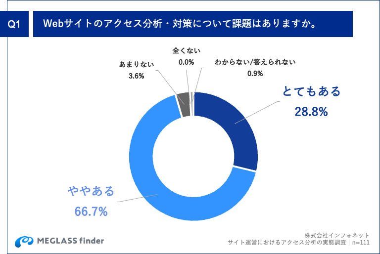 「Q1.Webサイトのアクセス分析・対策について課題はありますか。」(n=111)と質問したところ、「とてもある」が28.8%、「ややある」が66.7%という回答となりました。