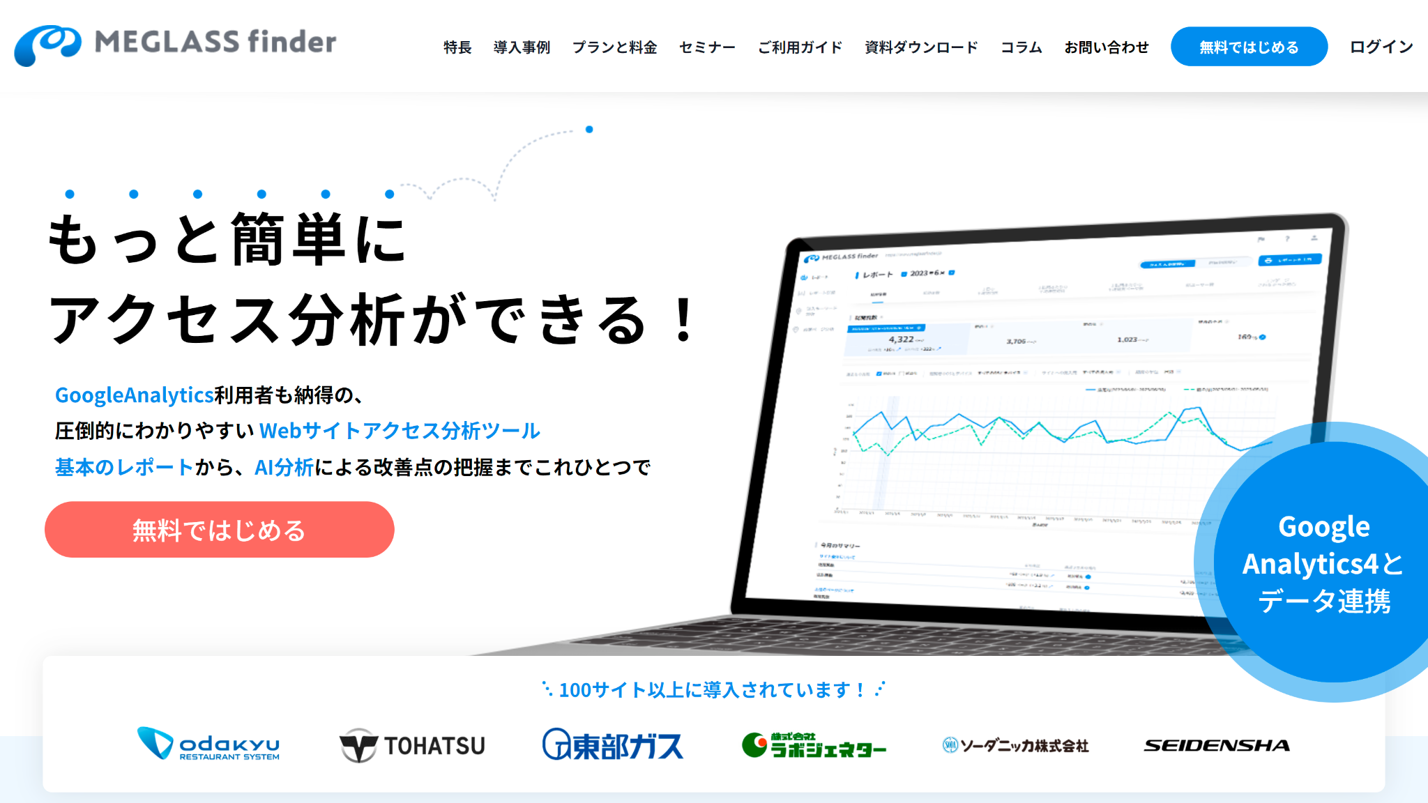 「MEGLASS finder 」は、専門知識がなくても圧倒的にわかりやすく、大幅時短を実現する「GoogleAnalytics4」連携型Webサイトアクセス分析ツールです。基本的なアクセス分析で使用する項目を簡単に確認・レポート出力できるため、毎月・毎週・毎日の分析を手軽にパパっと行えます。