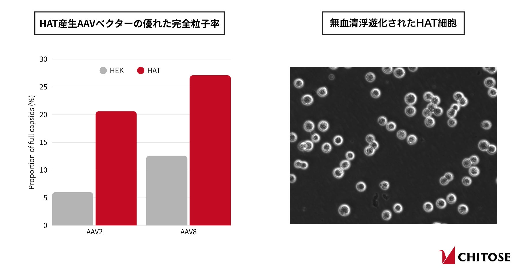 ちとせグループの中核法人である株式会社ちとせ研究所(以下、ちとせ)は、2022年に樹立した遺伝子・細胞治療用ヒト羊膜上皮由来細胞株(以下、HAT細胞)の商用提供を開始いたしました。HAT細胞は、従来の細胞株と比較してアデノ随伴ウイルス(以下、AAV)ベクターの生産収量および品質を向上させることで、バイオ医薬品製造コストの削減と遺伝子治療の普及拡大に貢献する可能性を有しています。本成果は、遺伝子治療分野で高い影響力を持つ査読付き国際学術誌に掲載され、その科学的妥当性が国際的に評価されました。