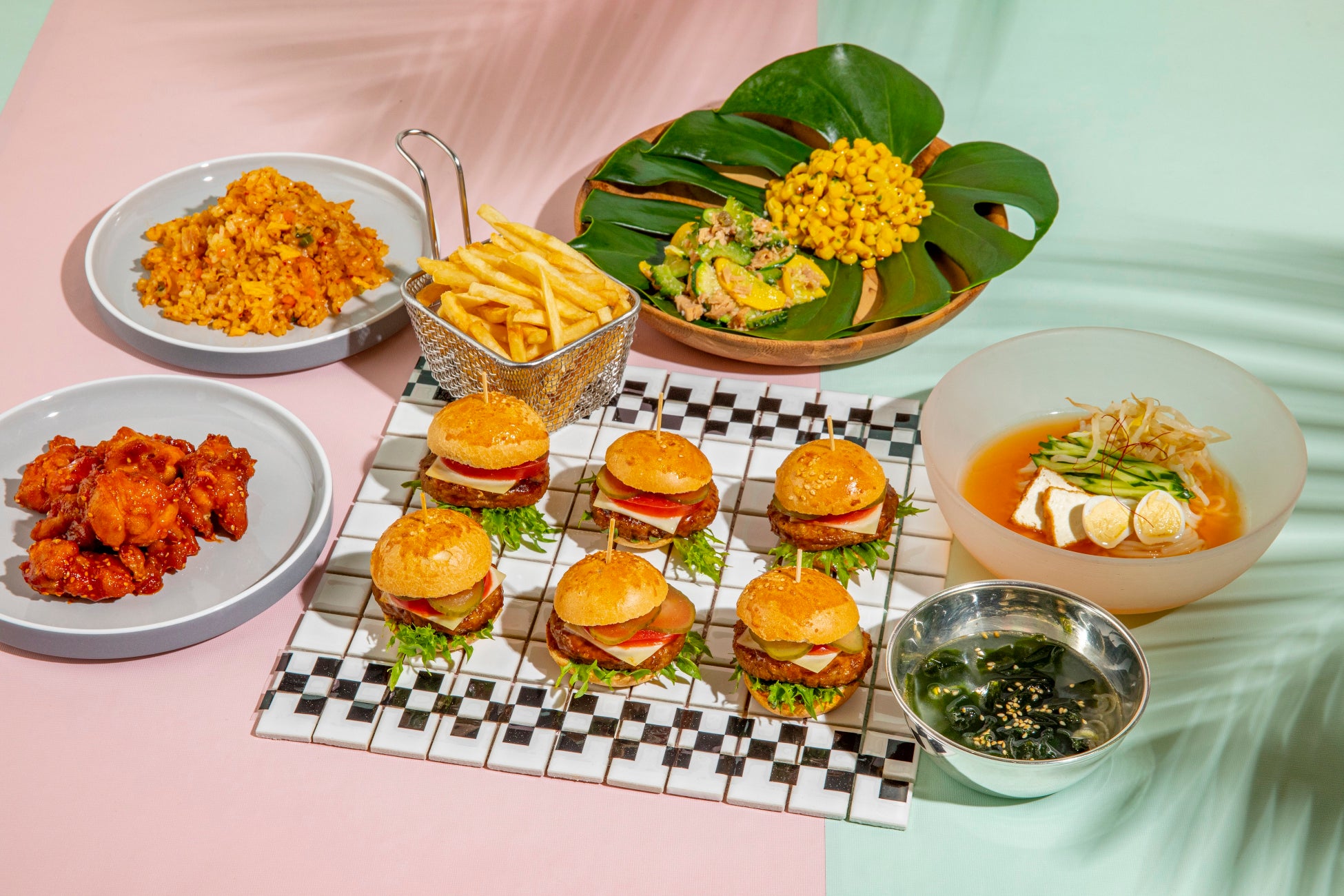 コリアンフライドチキン、キムチチャーハン、わかめスープ、冷麺、トウモロコシのガーリックマリネとアマニのロースト、夏野菜とツナのサラダ ココナッツ風味、ガーデンサラダ、フライドポテトにお好みのハンバーガーが作れるバーガーステーション。