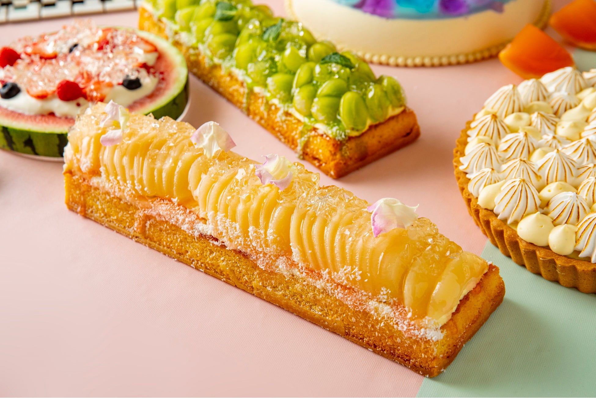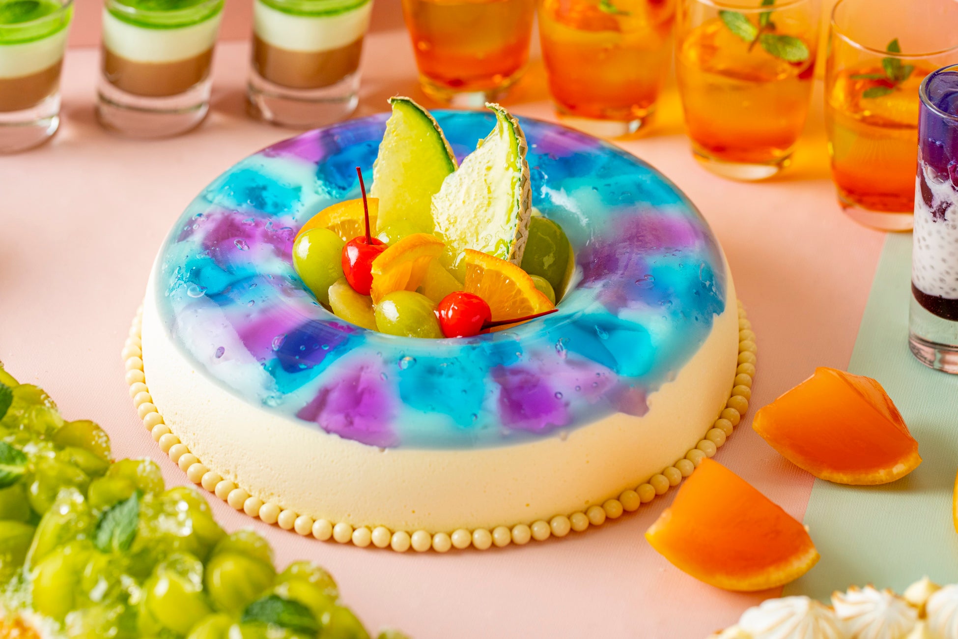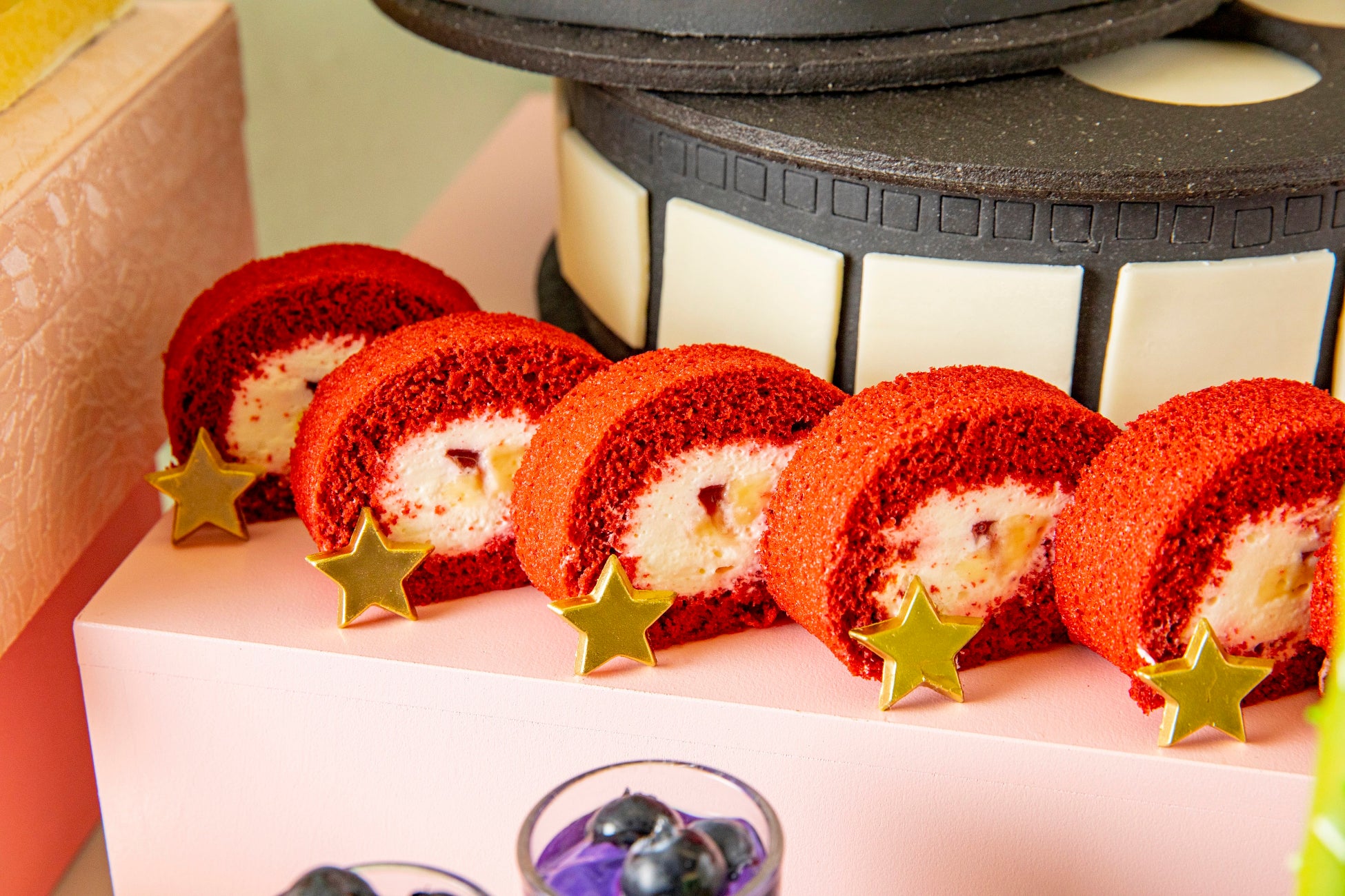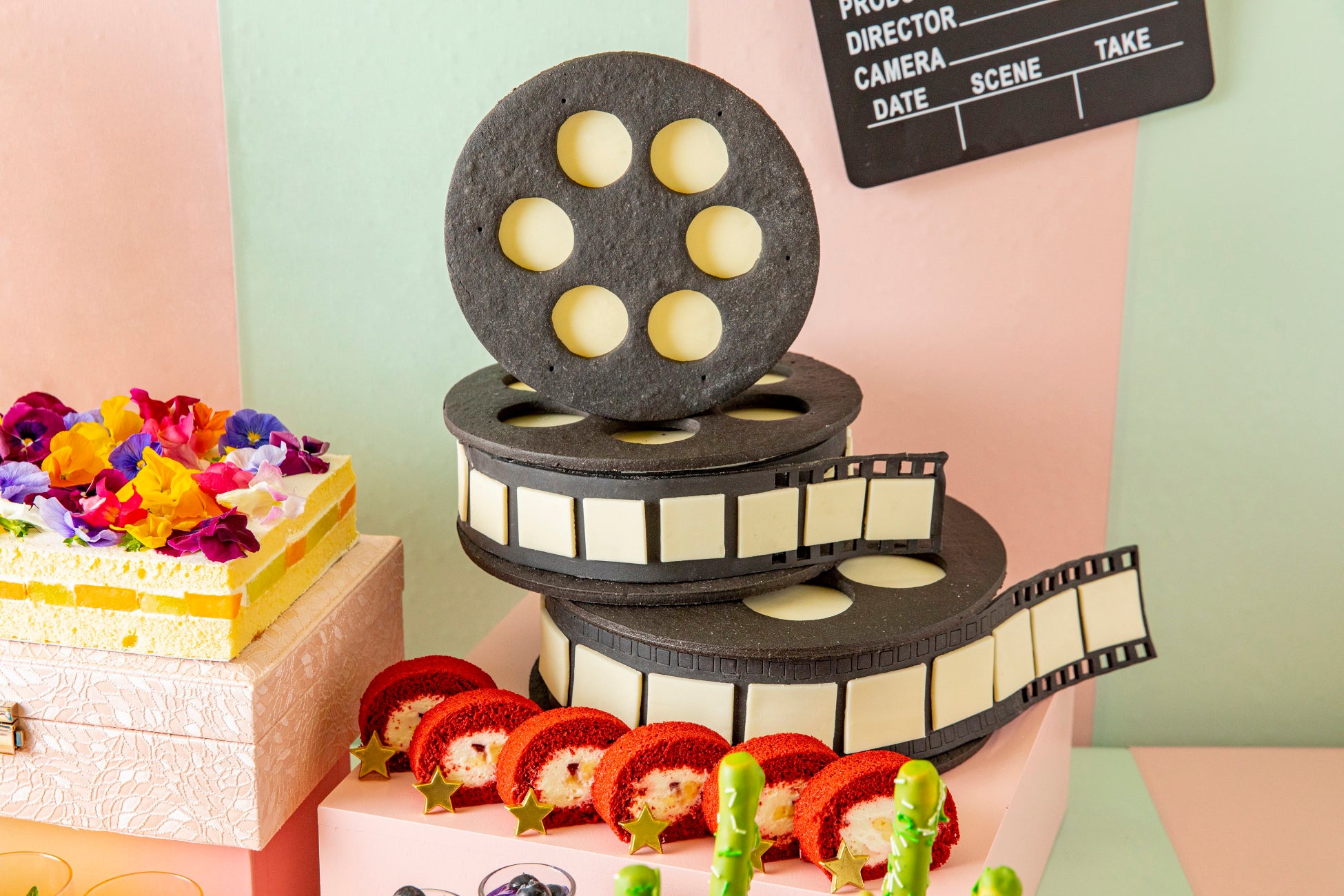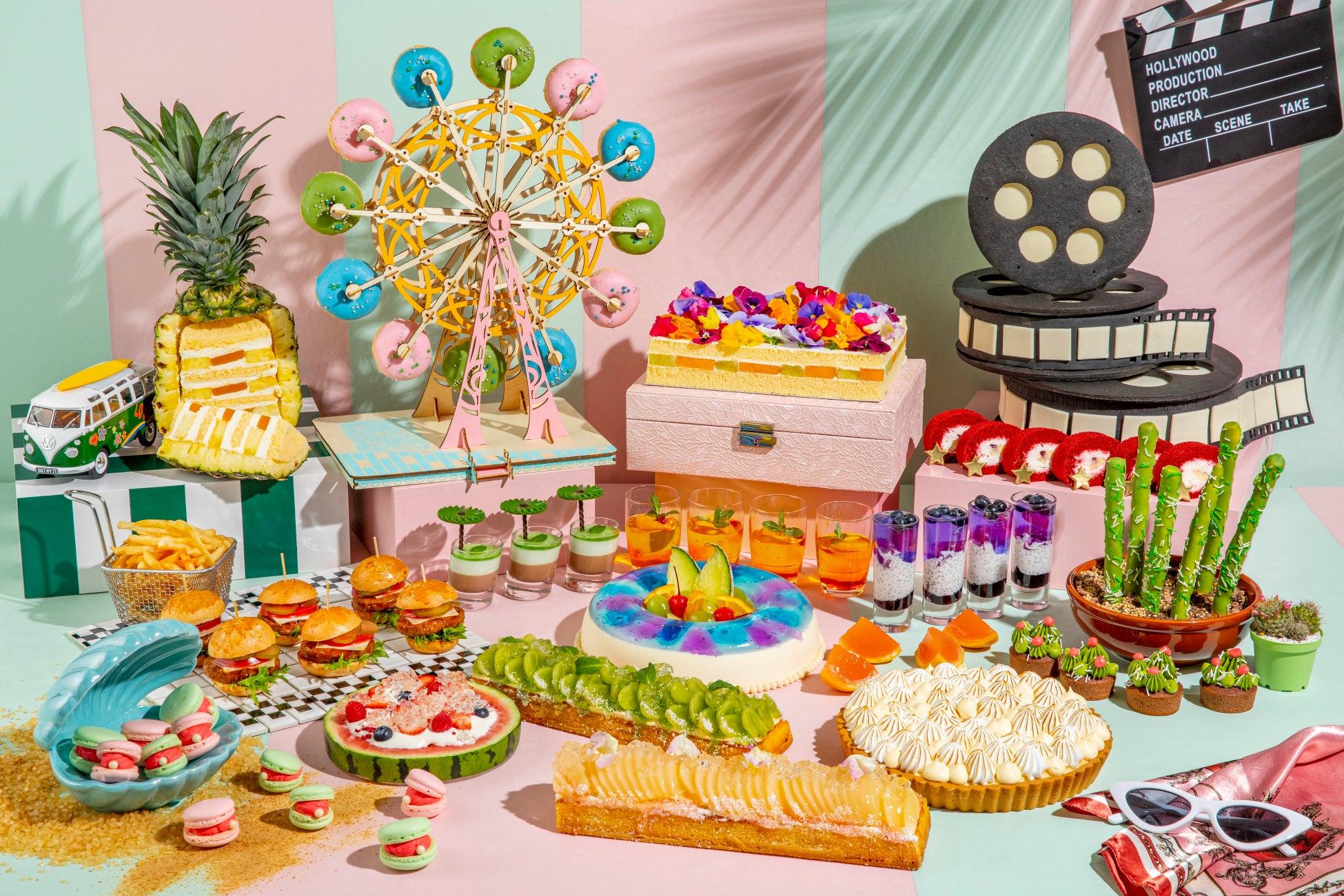 ビバリーヒルズエリアでは、エディブルフラワーを使用した上品な「フラワーショートケーキ」や、プールの水面が浮かんでいるような「ウォーターエンゼルムース」など、色鮮やかで華やかなスイーツが登場。サンタモニカの観覧車をイメージした「サマードーナッツ」は、遊び心をくすぐるエリアに。観覧車のドーナッツをお好きなだけお取り分けいただけます。ライブステーションは、ハリウッドエリアをイメージして、映画のフィルムを再現した「ハリウッドフィルムチョコレートケーキ」と「レッドカーペットロールケーキ」が登場。シェフが目の前でレッドカーペットロールを仕上げてくれます。