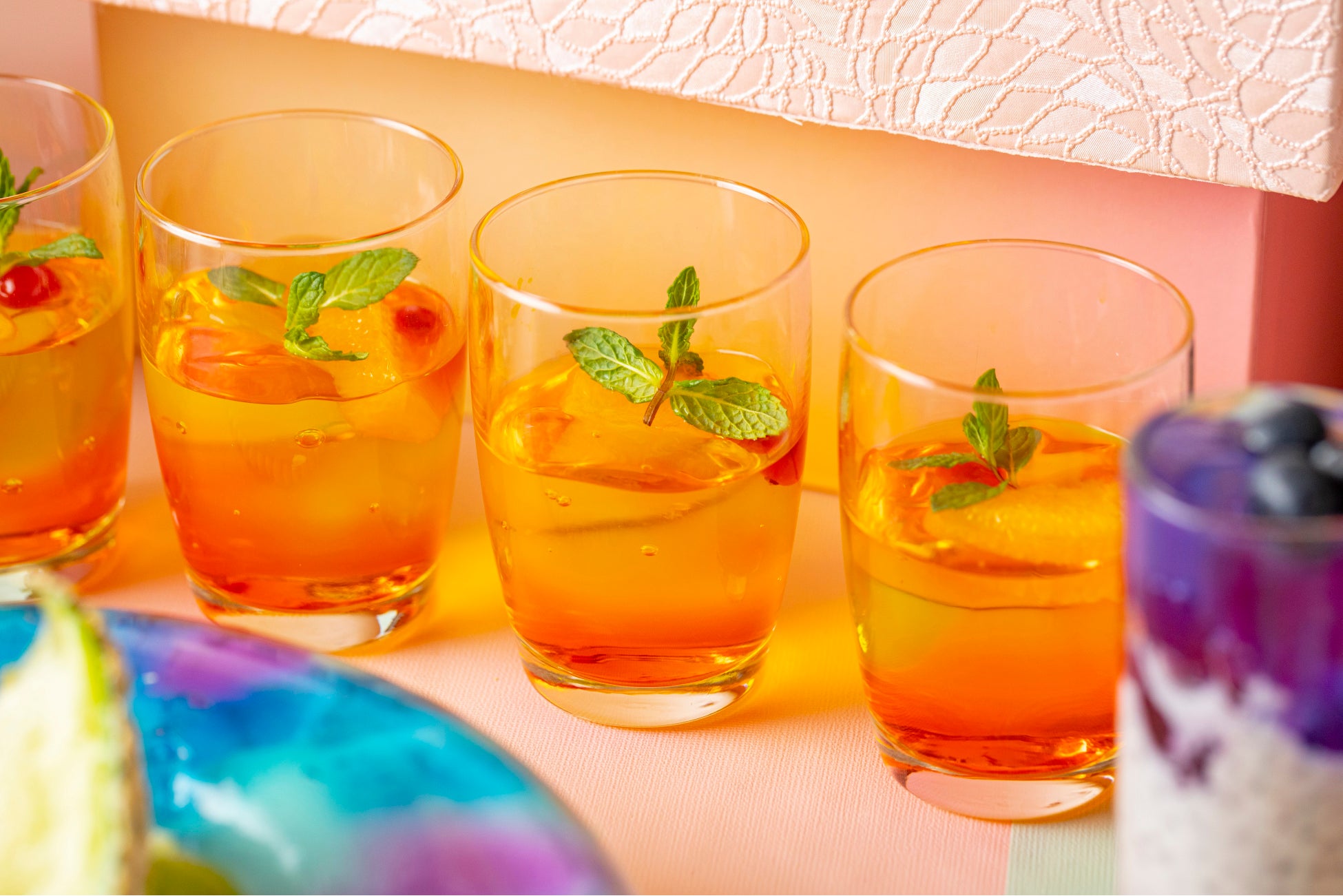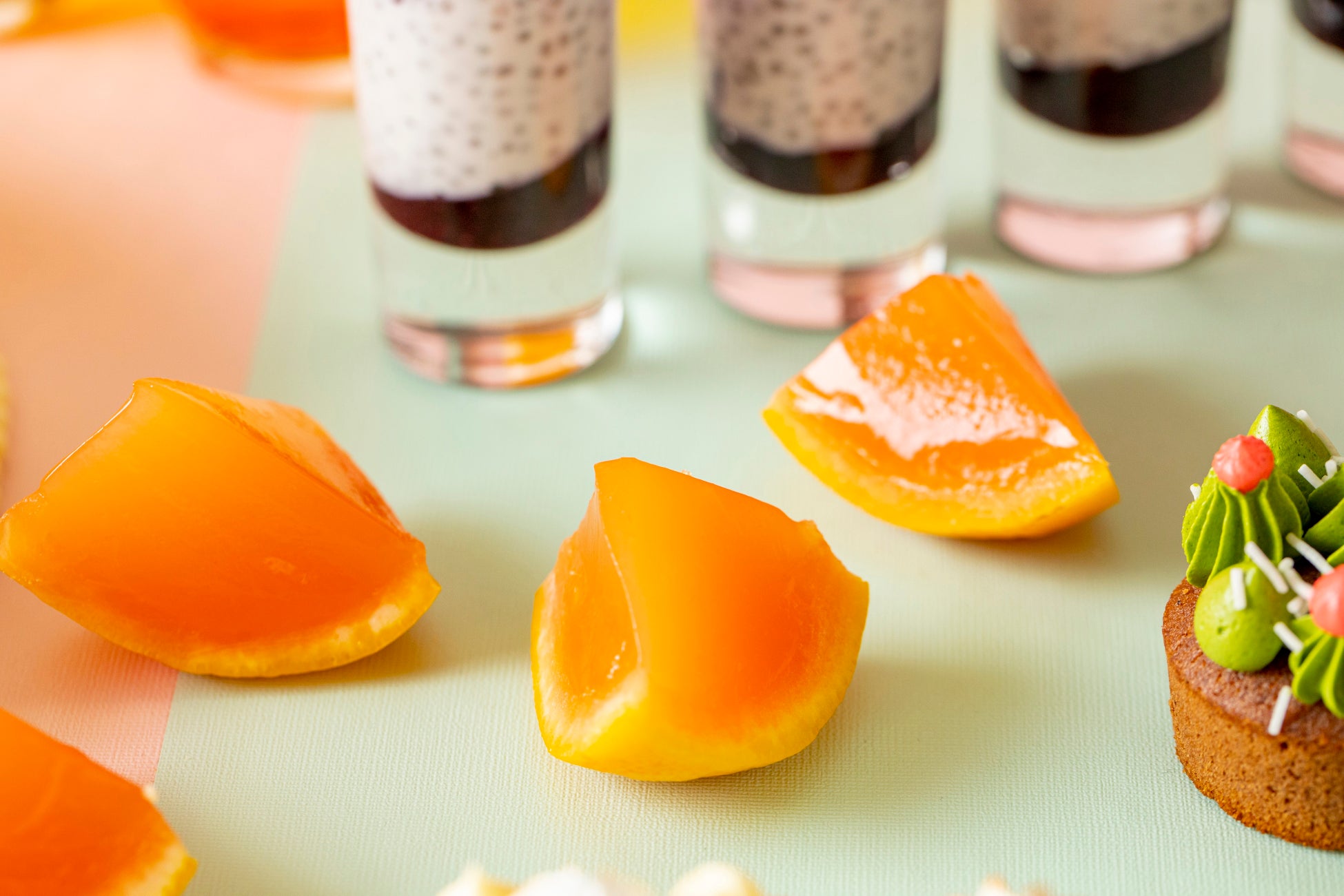 サンタモニカのピアで、大きな太陽が太平洋に沈む景色をイメージ。オーキッドのシロップがほんのり香るオレンジゼリー。