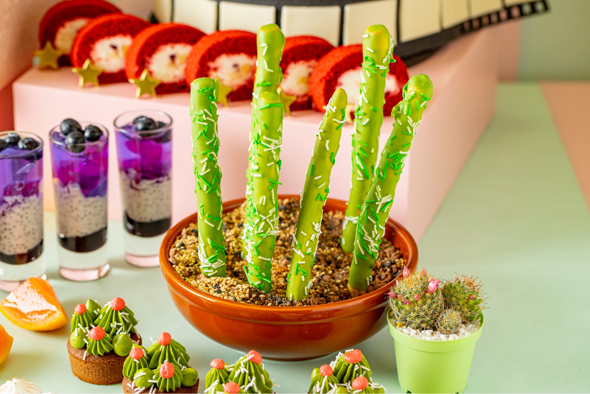 チョコレートコーティングで、サボテンに見立てたシンプルなグリッシーニ。