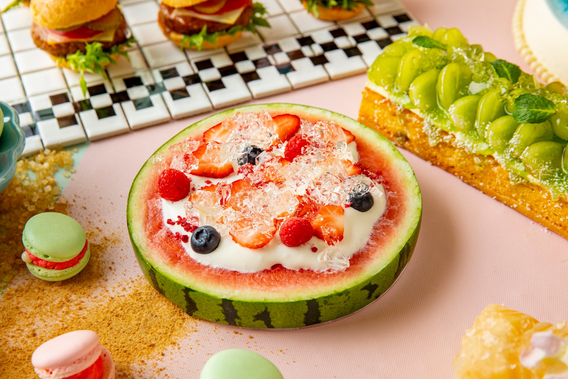 ジューシーなスイカに生クリーム、ベリー、ミントゼリーなどをトッピングしてピザ風に。