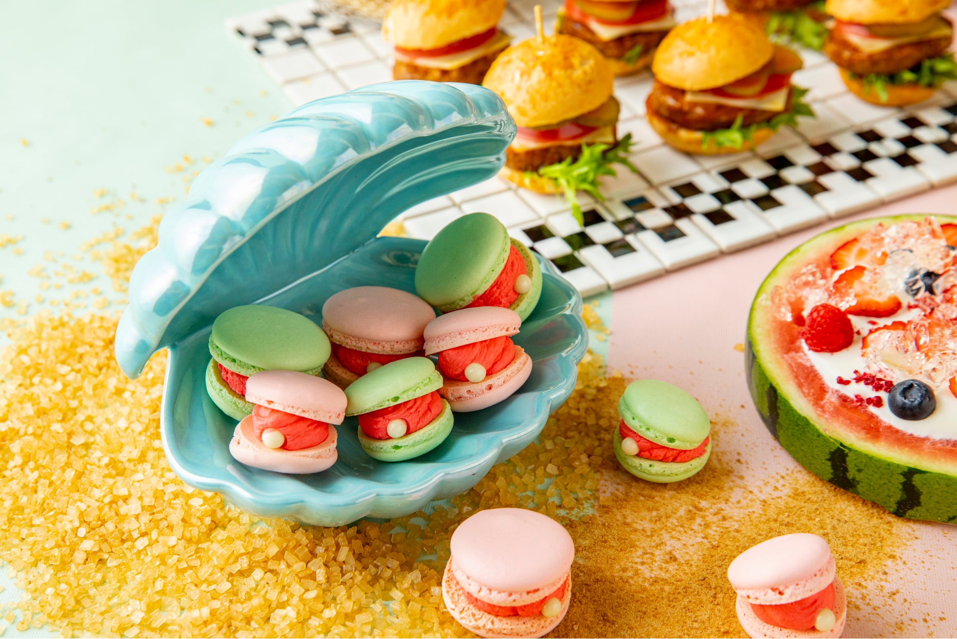 マカロンをミックスベリージャムとラズベリークリームでサンドし、海辺の貝殻に見立てました。