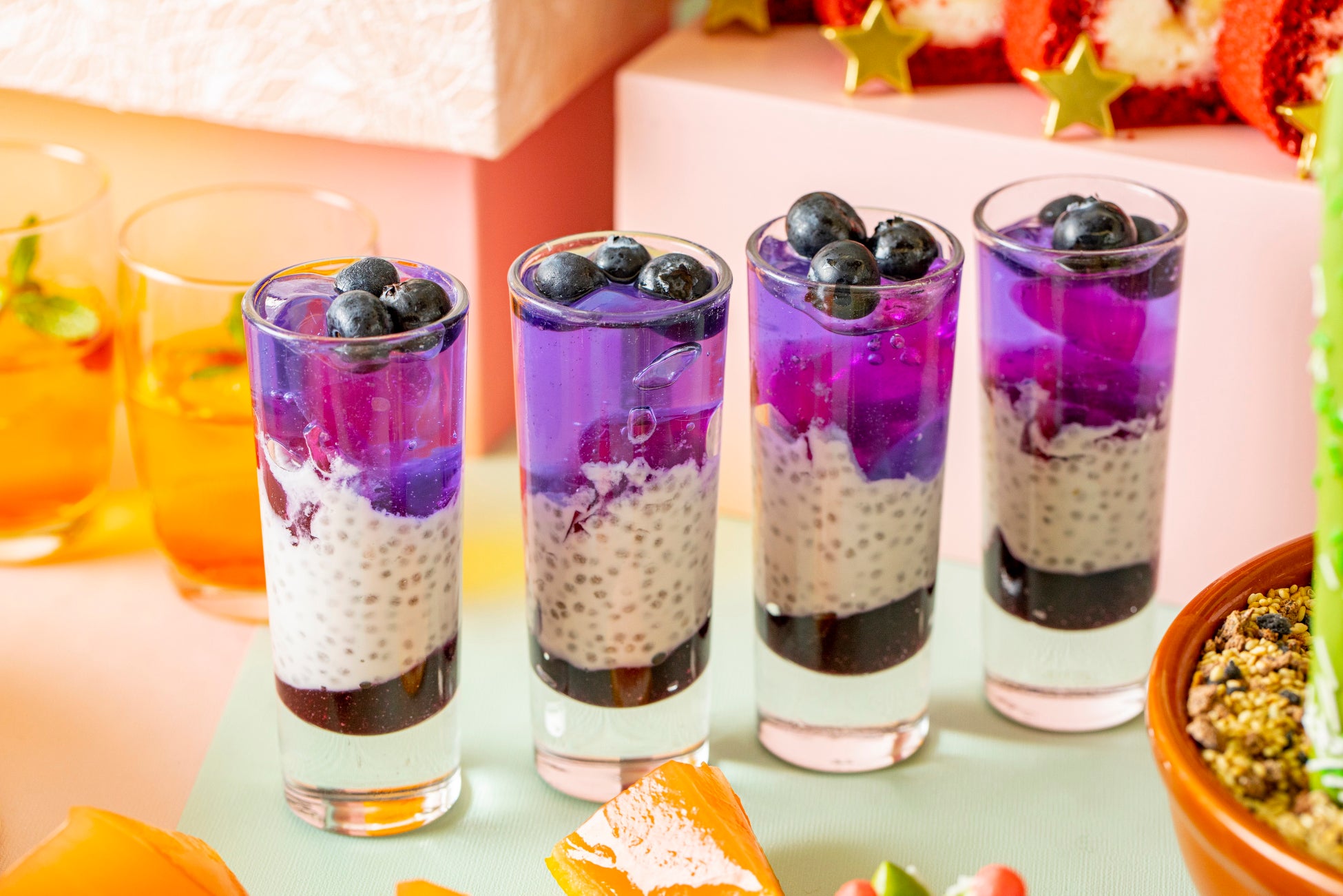 ブルーベリージャム、ミルクココナッツチアシード、ラベンダーゼリー、バタフライピーゼリーで夕暮れ時のビーチをイメージ。