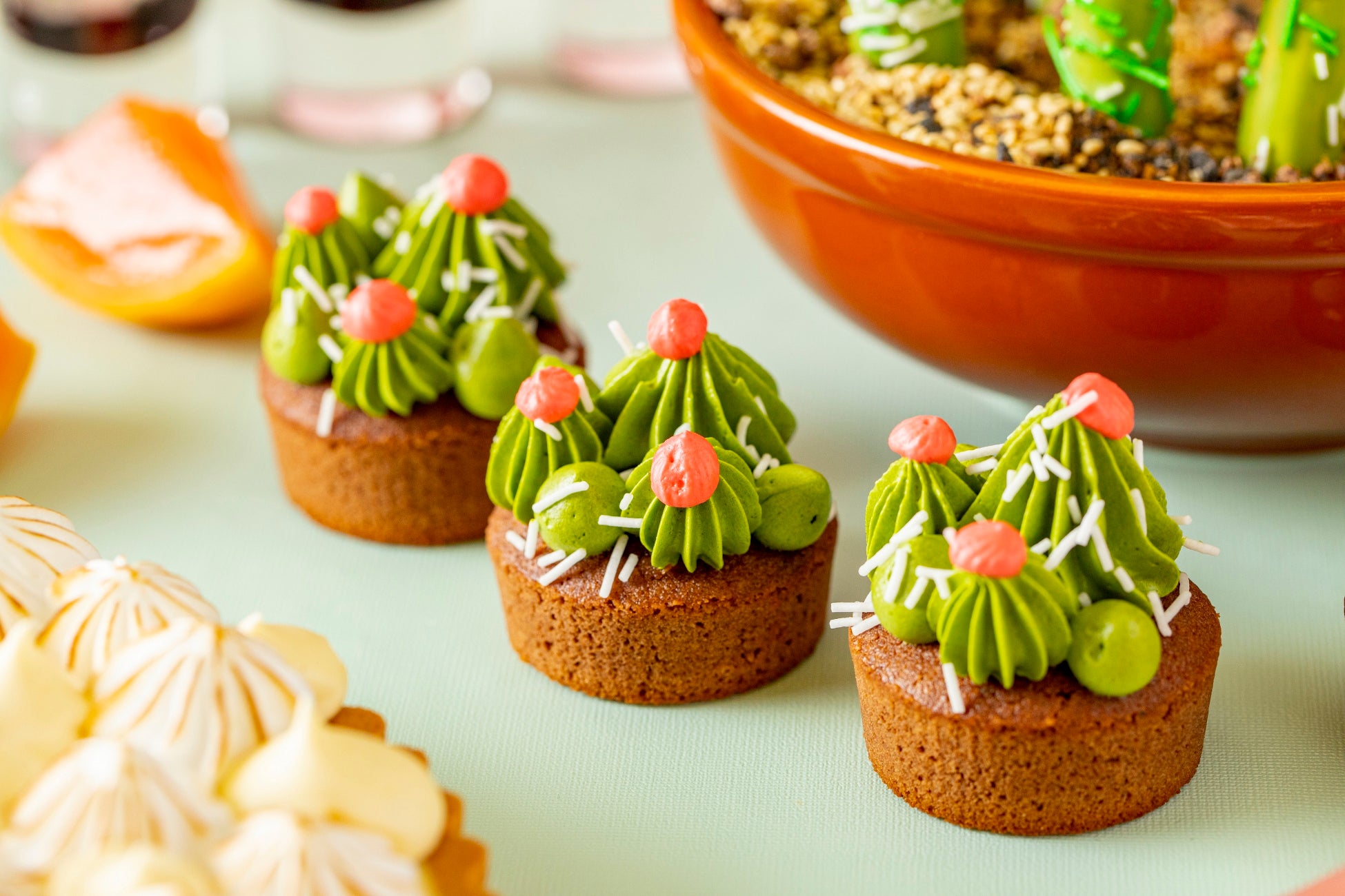 しっかりとした甘みと風味が特徴的なアマレナチェリーのシロップ漬け入りのアーモンドチョコレートケーキ。ピスタチオのバタークリームでサボテン風に仕上げました。