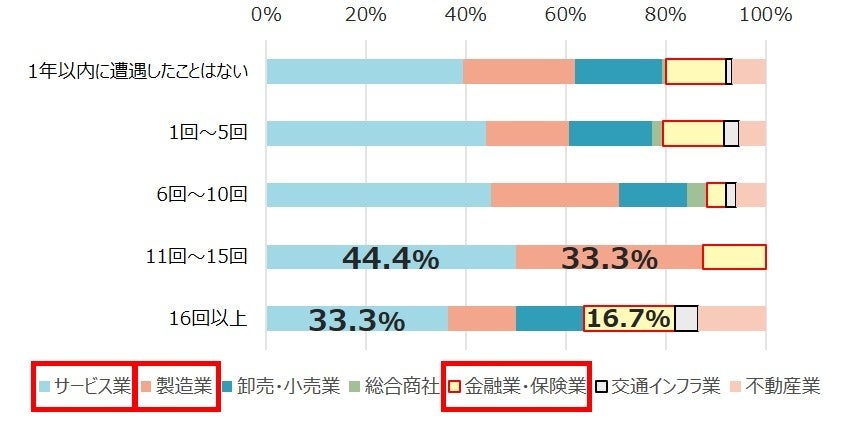業種別の傾向として11~15回受けたという回答の44.4 %をサービス業が占めた。16回以上受けたとの回答については総回答数が24件と少ないものの、そのうちサービス業が33.3%であり、金融業・保険業が16.7%であった。サービス業の現場では、かなりの数のカスハラが行われている可能性が示唆される結果となった。