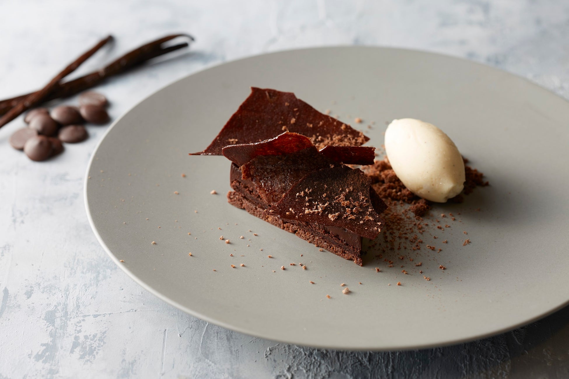 フランスのチョコレートブランド「カカオバリー®」の「マディオフォロ 65%」という、マダガスカル産のオーガニックチョコレートを使用し、きつい苦味や渋みのないマイルドな味わいを活かしたシンプルなタルトです。チョコレートのガナッシュは、融点の低い状態にすることで、より柔らかいくちどけや味わいをご堪能いただけます。アイスクリームは、オーガニック栽培されたバニラを手間暇かけて熟成させ、芳醇な香りを醸成したBROWN SUGAR 1ST.のマダガスカル産のバニラビーンズをふんだんに使用し、甘く優しい、香り高いバニラアイスに仕上げました。また、白砂糖は使わず、オーガニックシュガーを使用することで、素材そのもののコクや香りを引き出しています。