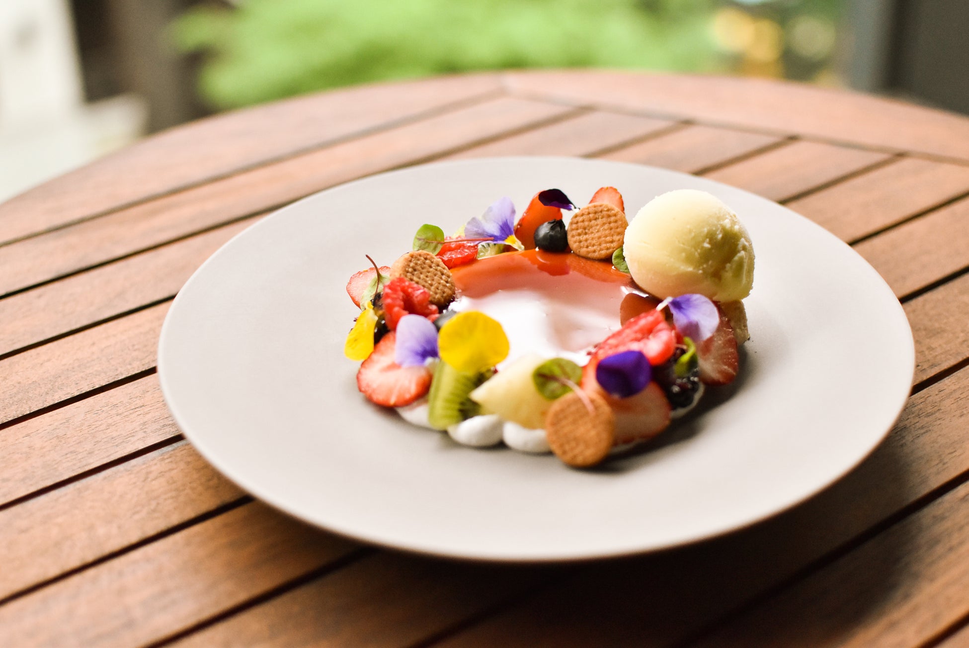 以前からNAMIKI667の定番メニューとしてご好評いただいていた「プリン ア・ラ・モード」が、動物性食材を使用せずに作られたヴィーガンデザートとして再登場いたします。ココナッツと豆乳をベースに少しのかぼちゃを混ぜ、仕上げに寒天を使用することでなめらかで柔らかい食感が楽しめるヘルシーかつコクのあるヴィーガンプリンに仕上がっています。豆乳クリームにメープルシロップを加えた優しい甘味のクリームに、プリンの周りには彩り豊かなフルーツを贅沢に飾り付けました。ココナッツをベースにバニラの香りづけをしたバニラアイスを添え、満足度の高い味わいと、見た目の華やかさもお楽しみいただける逸品です。