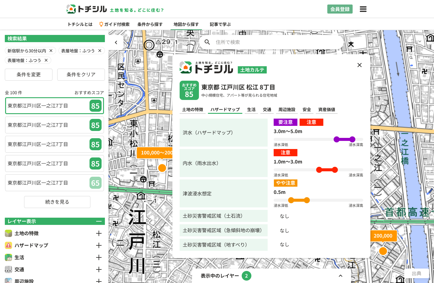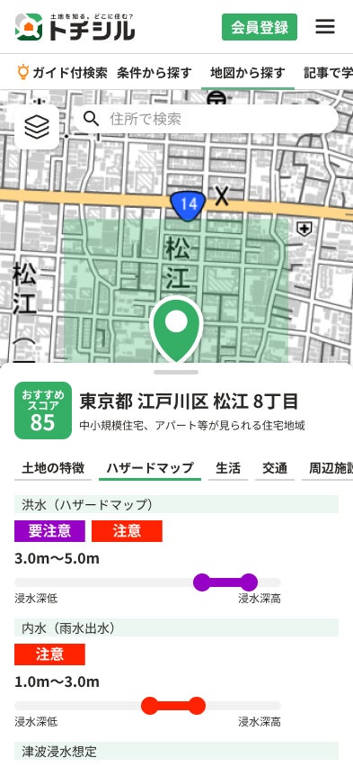 「トチシル」は、単なる物件検索サイトではありません。地価、地盤、ハザード、治安、利便性など、住まいに関わるさまざまなデータを地図上で統合し、直感的に検索できるプラットフォームです。