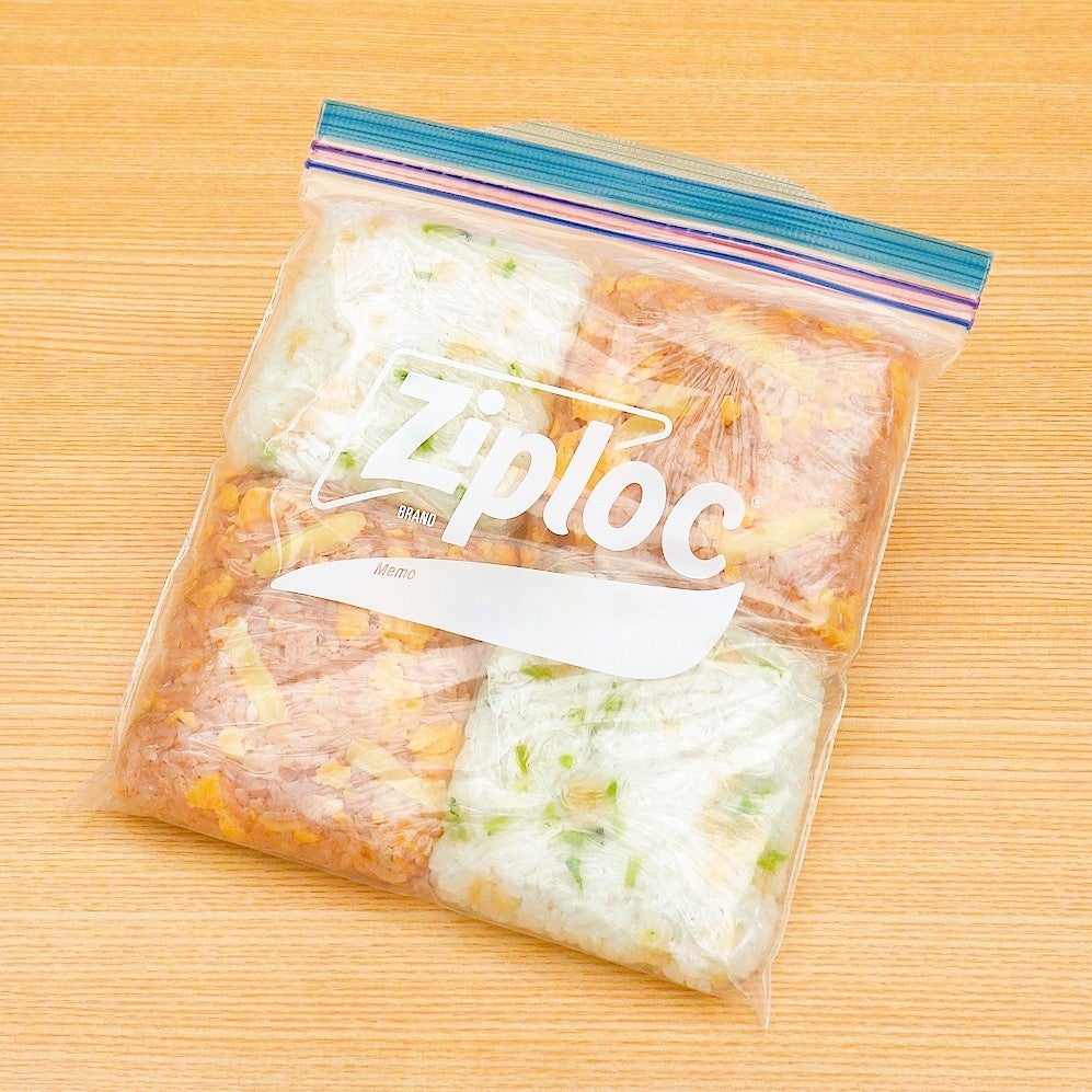 ①サランラップ®︎に包んでざぶとん型に整えたおにぎりをジップロック®︎フリーザーバッグに入れて