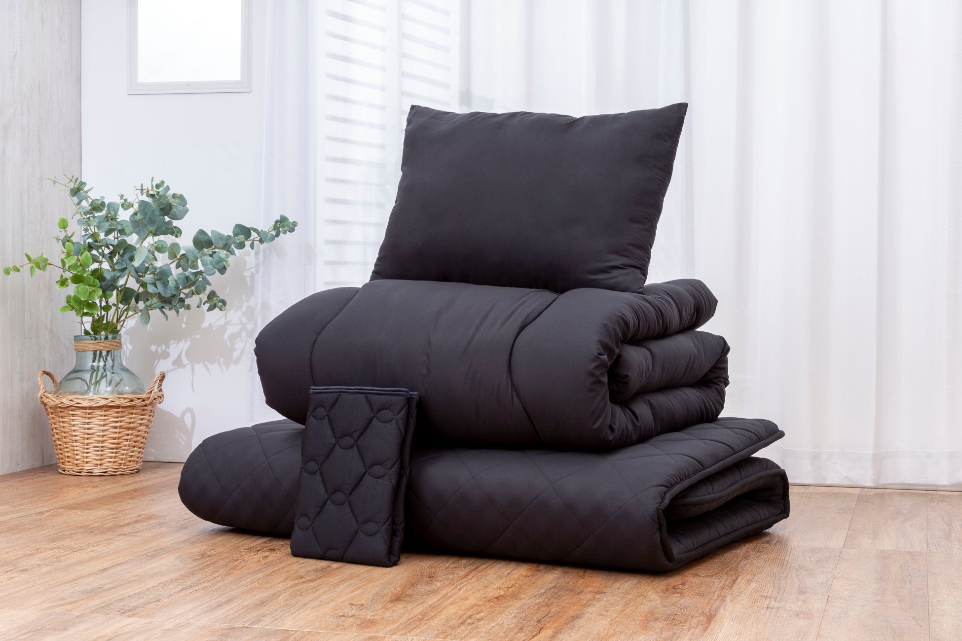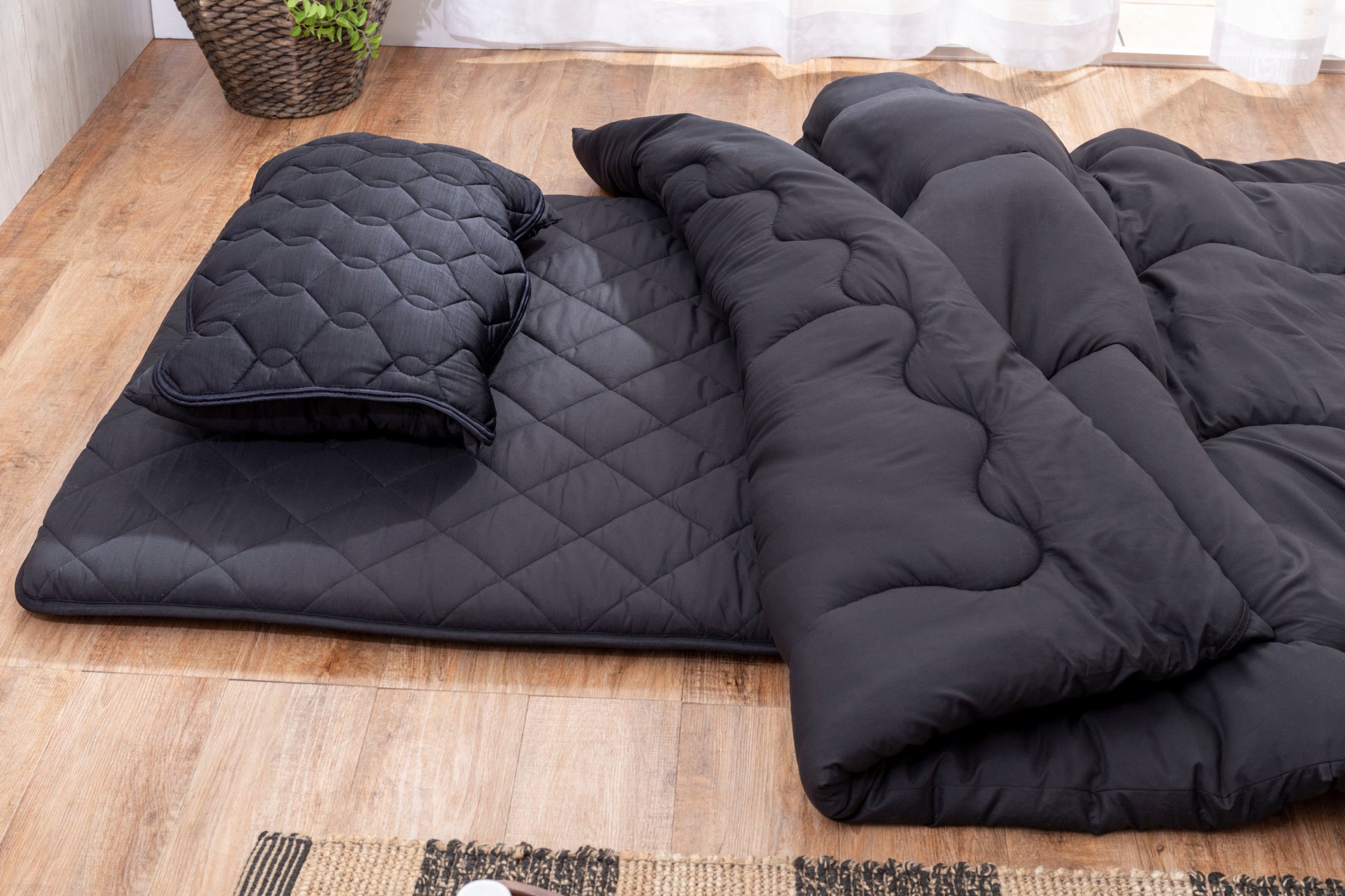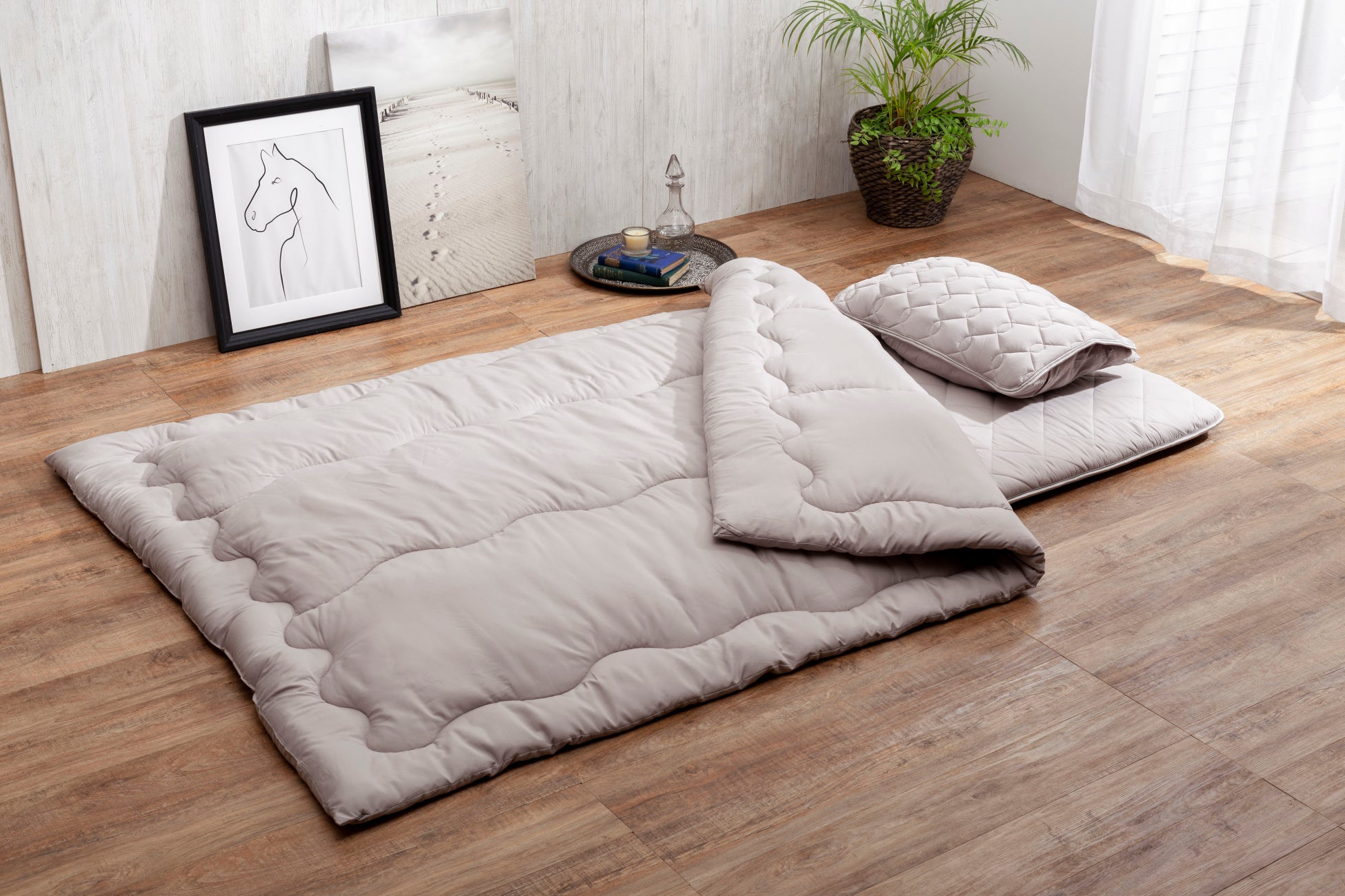2. 敷布団は体を点で支え、体圧分散性に優れるプロファイルウレタン入り3層構造。睡眠時の体の負担を軽減、自然な寝姿勢をサポートします。芯のウレタンを傷めない多針キルト採用で、耐久性もアップ。固綿入りのものより通気性に優れ、軽量。三つ折りにもでき、収納も簡単。ウレタン入りの3層構造なので、フローリングに直接敷いた場合の底付き感を軽減。敷布団の全長は200cm、ベッドフレームやマットレスの上に敷いてもはみ出ず、併用使用も可能です。