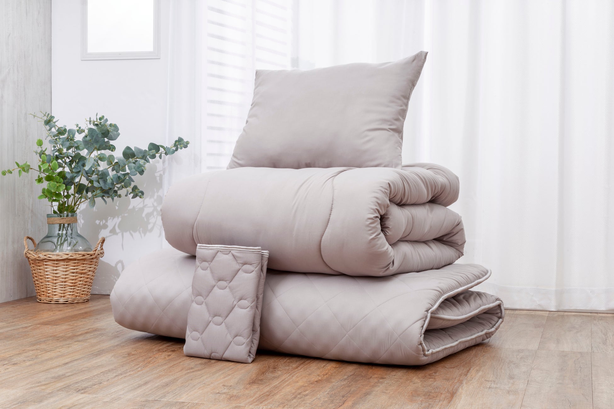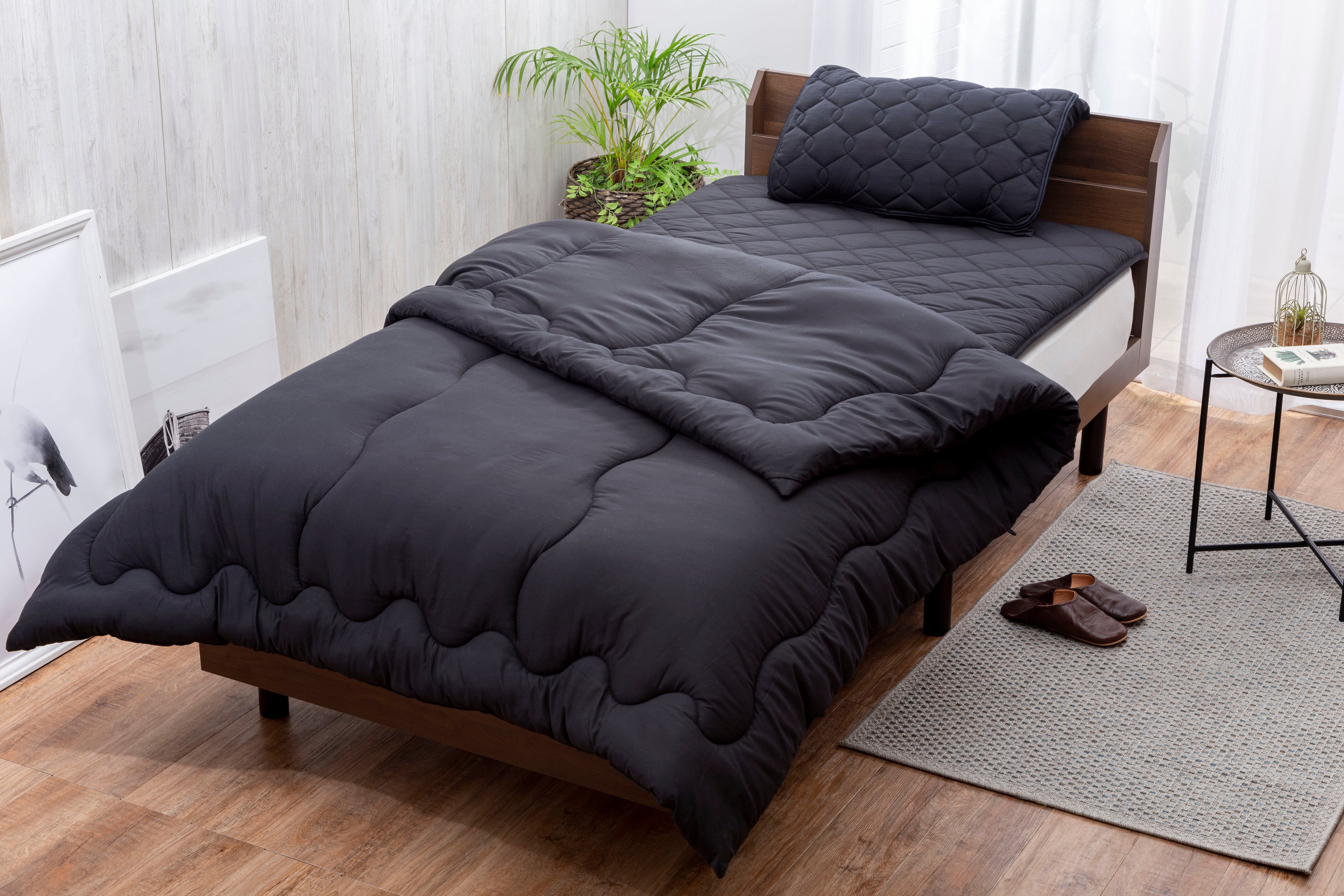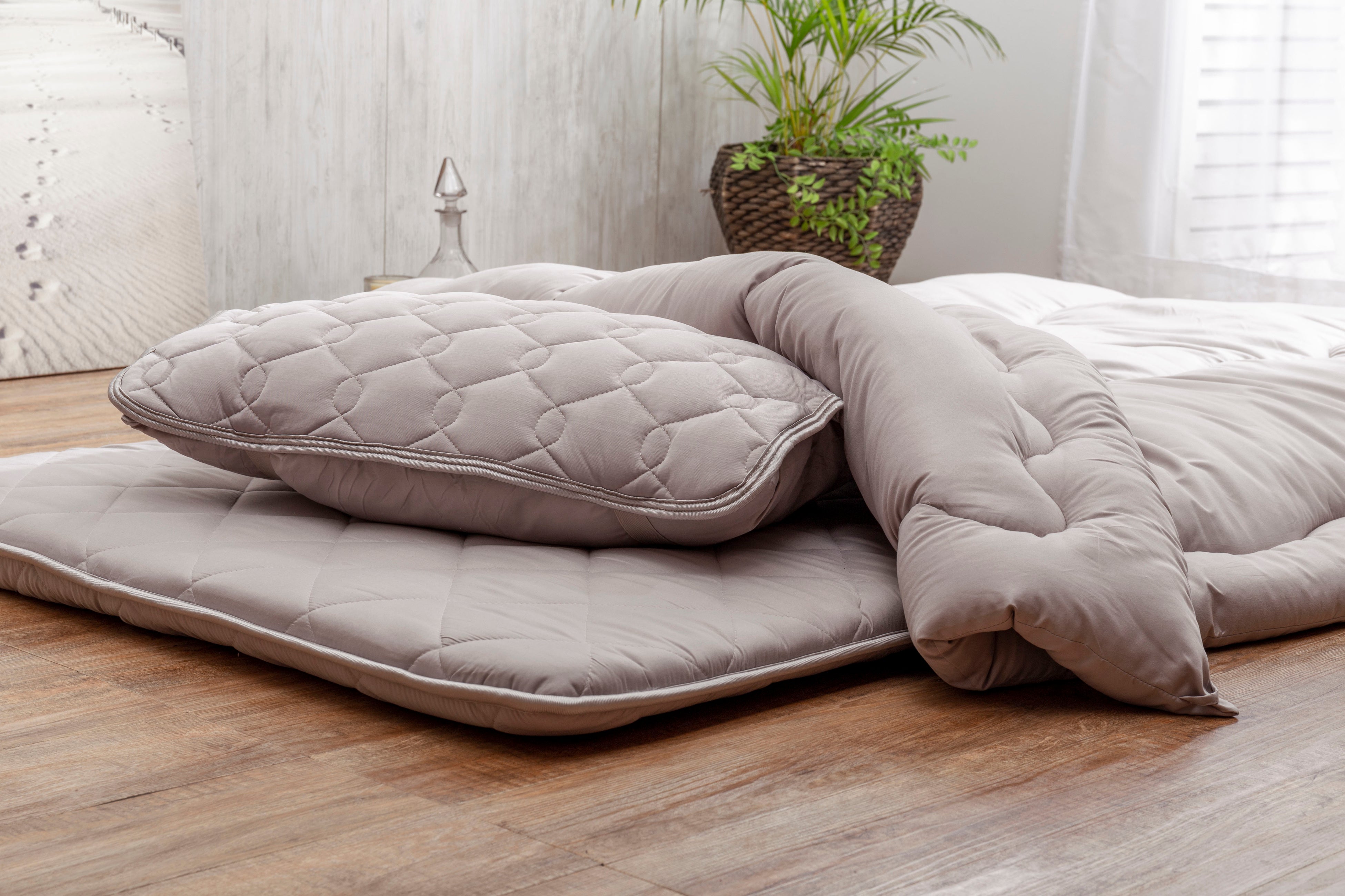 3.敷布団・掛布団・枕の側生地には、ダニやホコリを通さない高密度加工を施し、薬剤を使わずに天然の防ダニが実現しました。中綿には、ストロー状の繊維で空気をたっぷり含み保温性が高く、ホコリが出にくい中空ポリエステル綿を使用。さらに、敷布団以外は丸洗い可能なので、天日干しでは落せない汚れにも対応でき、ハウスダストやアレルギーを気にされる方にもおすすめです。