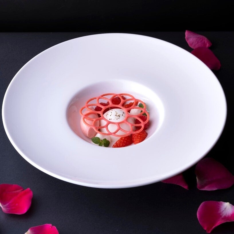 苺とクリーミーなバニラ、ラズベリーソースが絶妙に組み合わさった「ストロベリー・フローティングアイランド」という名のデザートです。新鮮な苺、甘く魅惑的なトンカ豆の香りがついたポーチドエッグホワイトに、アーモンドラズベリーのチュイルを飾りました。パーク ハイアット 東京 エグゼクティブ ペストリーシェフ、ジュリアン・ペリネ考案の繊細で美しいデザートです。