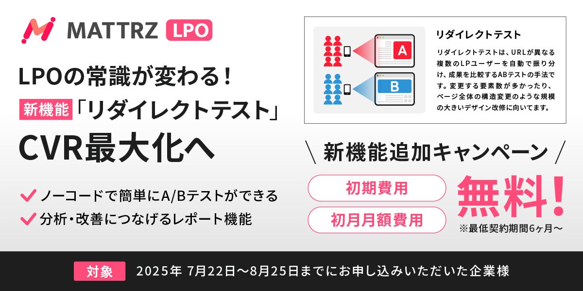 Mattrz株式会社(東京都千代田区、代表取締役:横川慶毅)は、提供するLPOツール「MATTRZ LPO」に、URLが異なる複数のLP間で成果比較が可能な新機能「リダイレクトテスト」を追加しました。