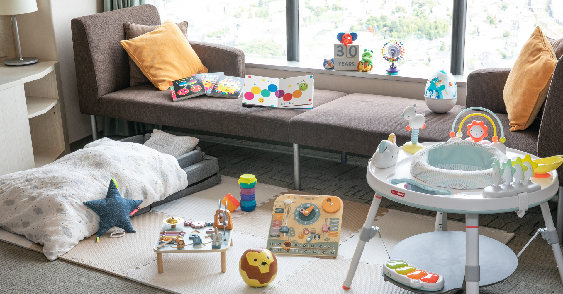 2022年4月、共に30周年を迎えることを記念して、赤ちゃんとご一緒のご家族でも安心してホテルステイを楽しんでいただきたいとの思いをもとにコラボレートしたステイプランが大変ご好評いただきました。第二弾のコラボレーションプランでは、ベビー寝具や幅広い月齢に対応するおもちゃを追加するアップデートを行いました。お子さまとの初めてのホテルステイをサポートするアイテムが充実し、さらに快適にお過ごしいただけます。また、お土産をリニューアル。お食事エプロン、おやつを持ち運べるスナックカップ、お風呂おもちゃの新商品をご用意しました。