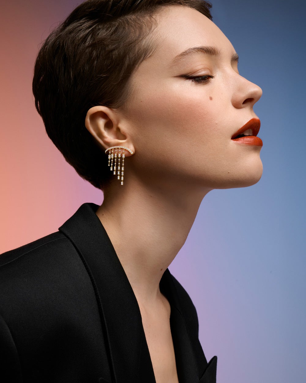 今シーズンのステートメントピースである「シャンデリア ラディアント イヤーカフ」。流麗なラインを描き、耳全体をダイヤモンドの光で包み込む優美なデザインのイヤーカフは、VVSクラスのダイヤモンドを207ピースあしらったファインジュエリー。ダイヤモンドのテニスチェーンが身体の動きに呼応してしなやかに揺れ、身にまとう方と共鳴する凛とした輝きをもたらします。